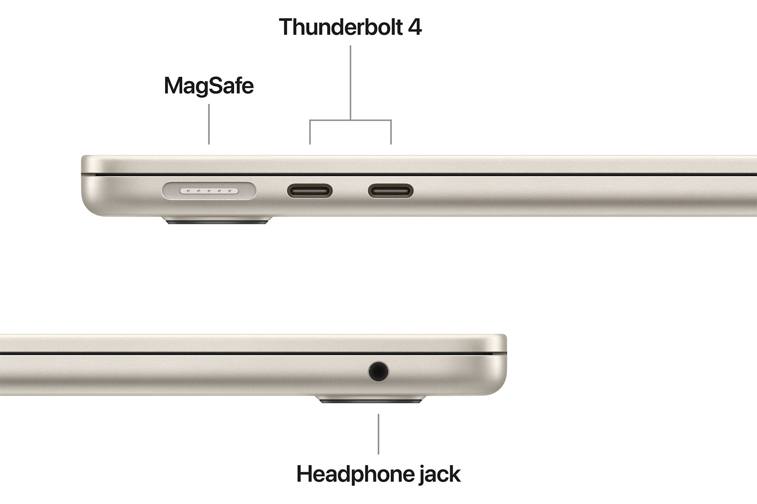 The MagSafe charging cable attaches and detaches magnetically in case anyone trips over it. Two Thunderbolt 4 ports let you connect high-speed accessories and charge your Mac. The headphone jack supports high‑impedance headphones. And Wi‑Fi 6E provides up to 2x faster throughput compared with Wi‑Fi 6.[7]
