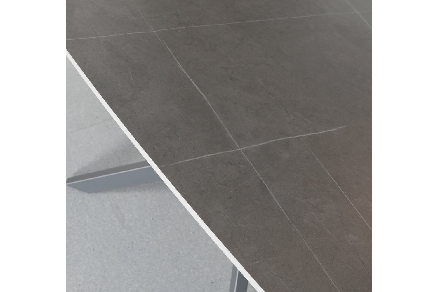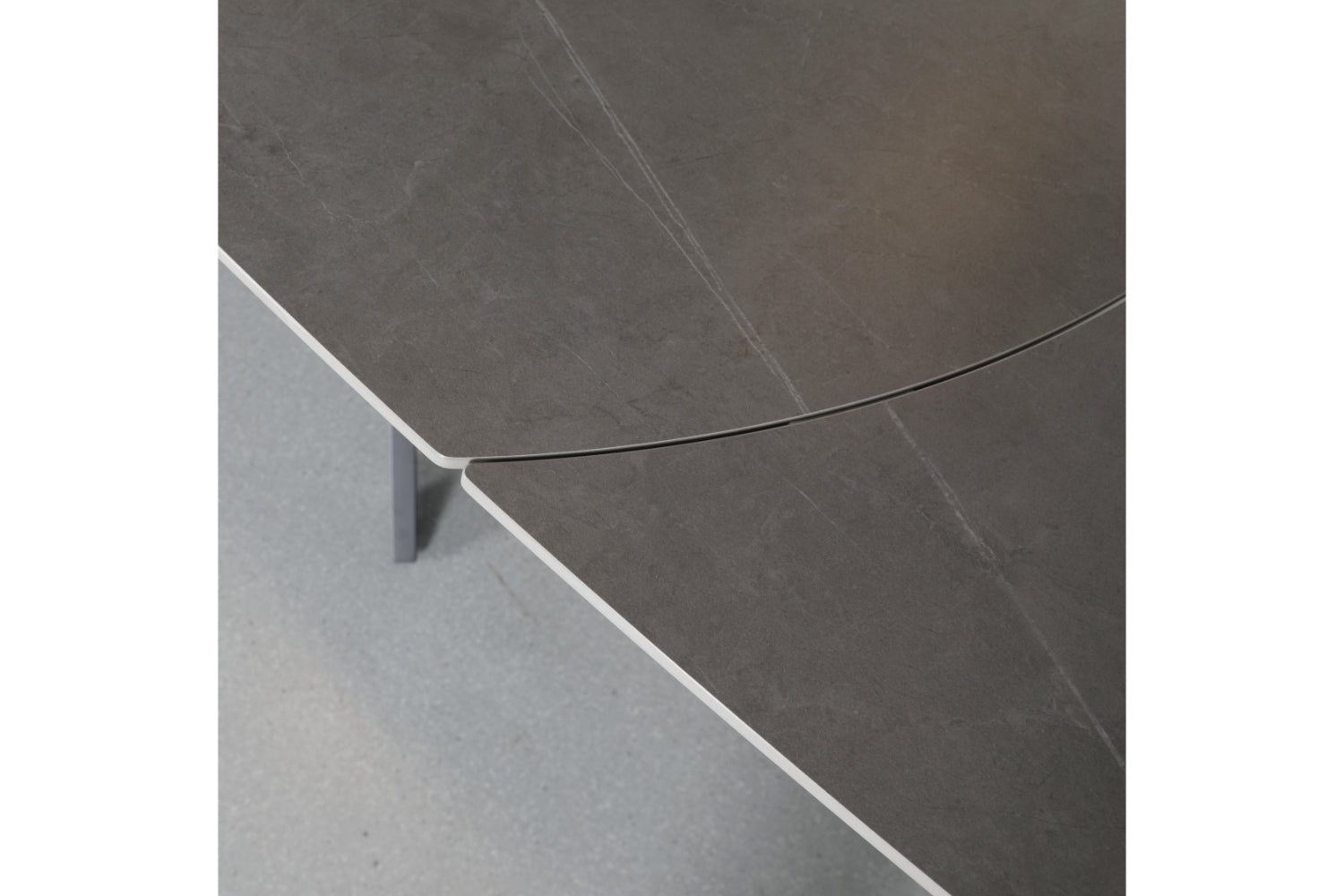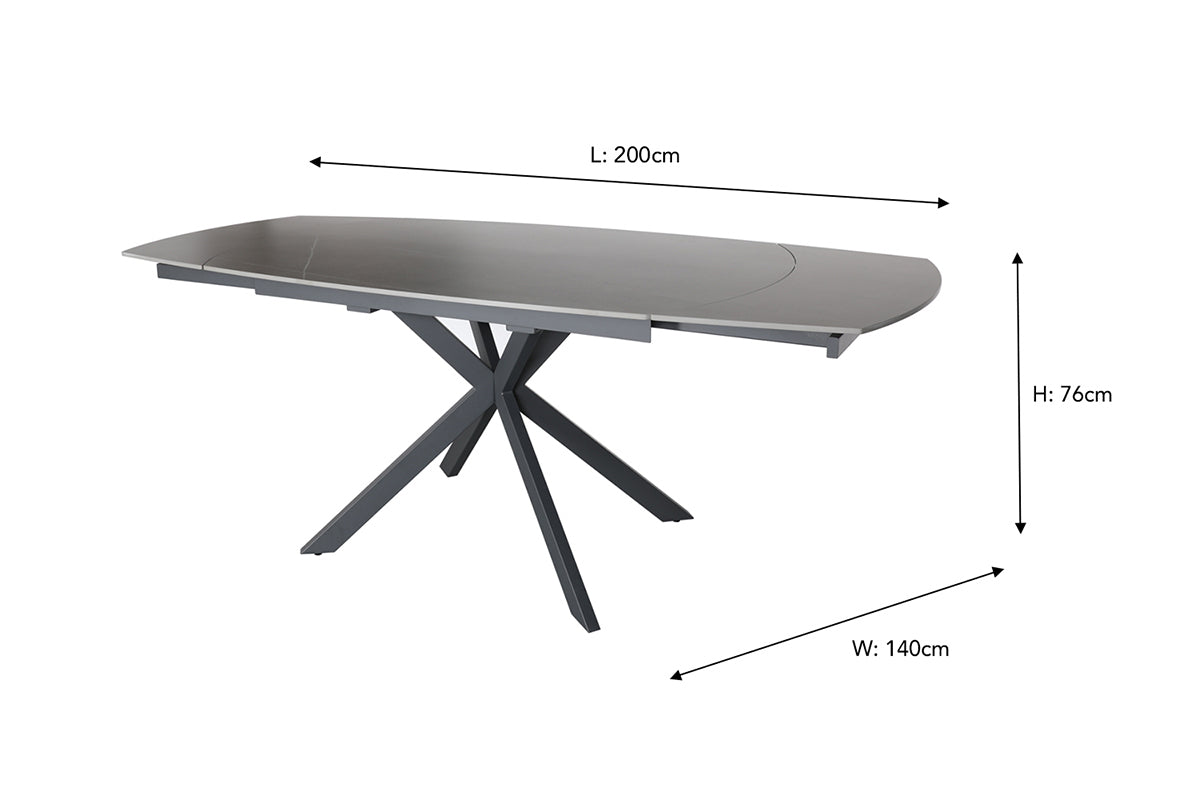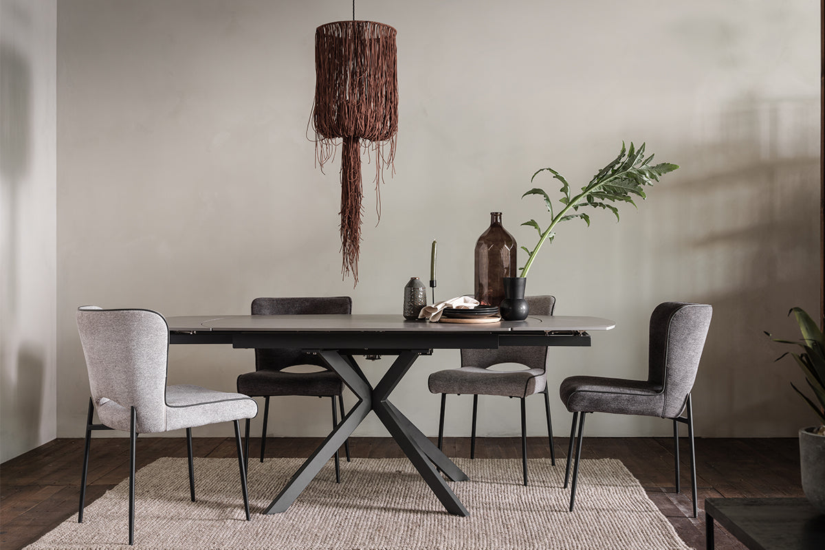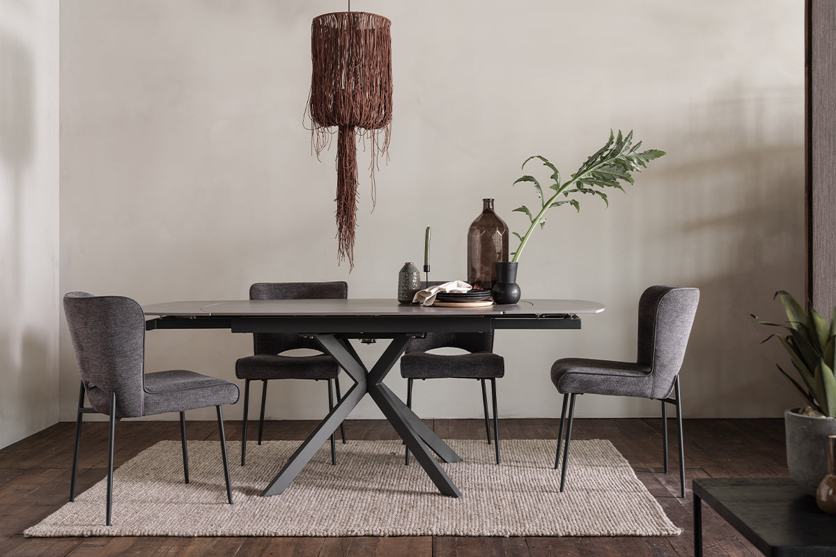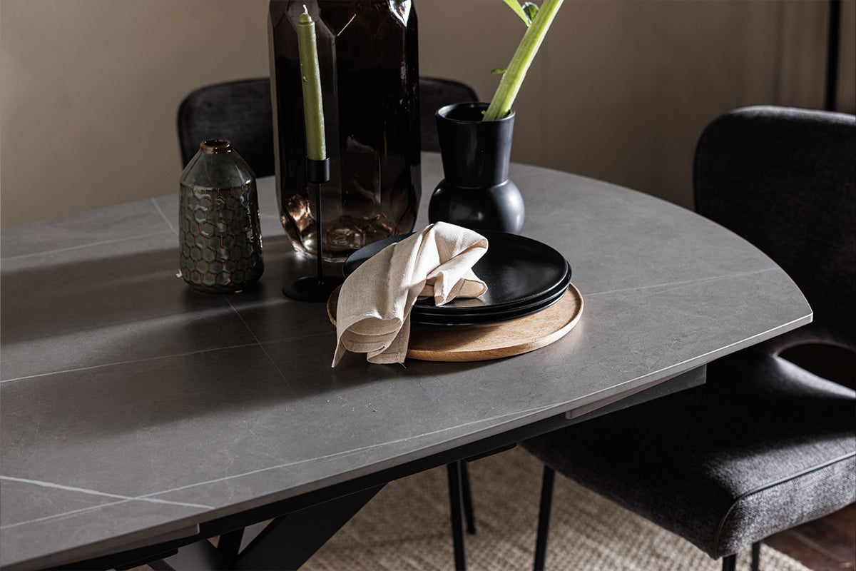 Coupling a modern mirrored sensibility with high-quality metal and stone, the esteemed Elder extending dining table delivers a sleek and enduring foundation for your dining space. Crafted with precision, it features a stone tabletop that is heat-, cold-, and scratch-resistant making it incredible durable. It rests upon exquisite V-shaped metal pillars that allow for more space between chairs for leg room, stealing the spotlight with its blend of style and efficiency. It’s complete with an extending mechanism allowing for more space at mealtimes and perfect for hosting dinner parties for guests.