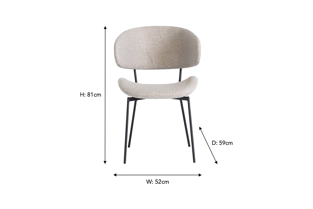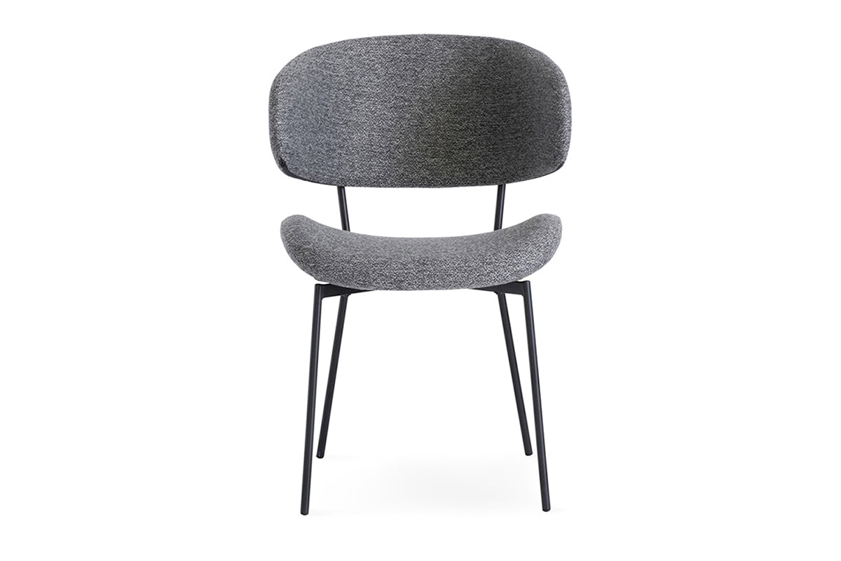 This chair’s heavy woven, textured fabric upholstery works perfectly with the slim black legs beneath. Its shape is geared towards total comfort, with its beautifully scalloped seat and back.