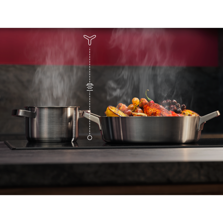 The Hob2Hood® function connects the hob and the hood. The cooker hood automatically adjusts the fan speed based on the heat, without lifting a finger. For powerful extraction when searing. And quieter extraction when simmering.
