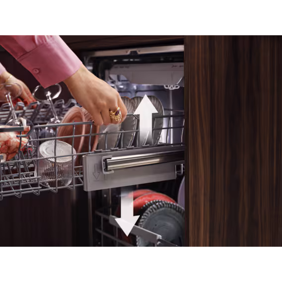 Easily create more space at the top or bottom with the height-adjustable upper basket. Simply grab the handle on both sides of the upper basket and slightly pull up to raise or lower either side or both sides.