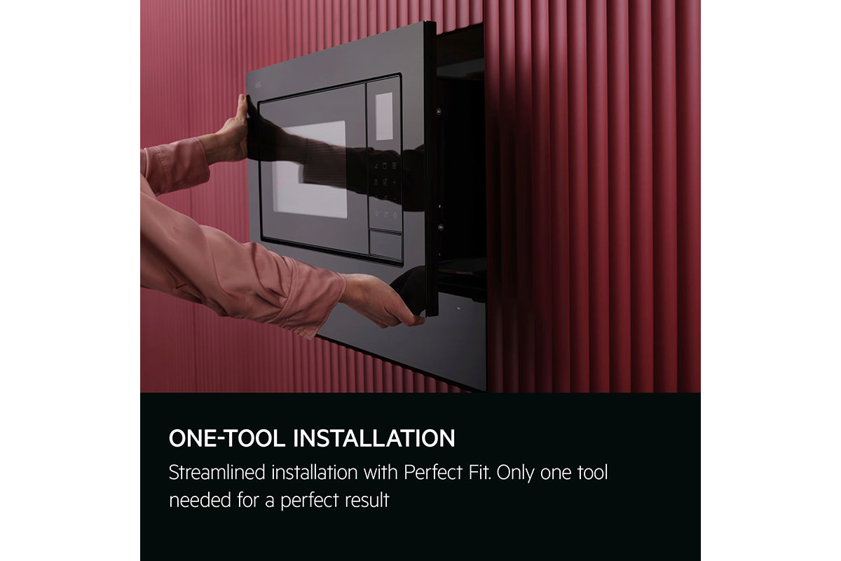 The microwave's sleek, minimalist design in high-gloss black matches the oven and other appliances.