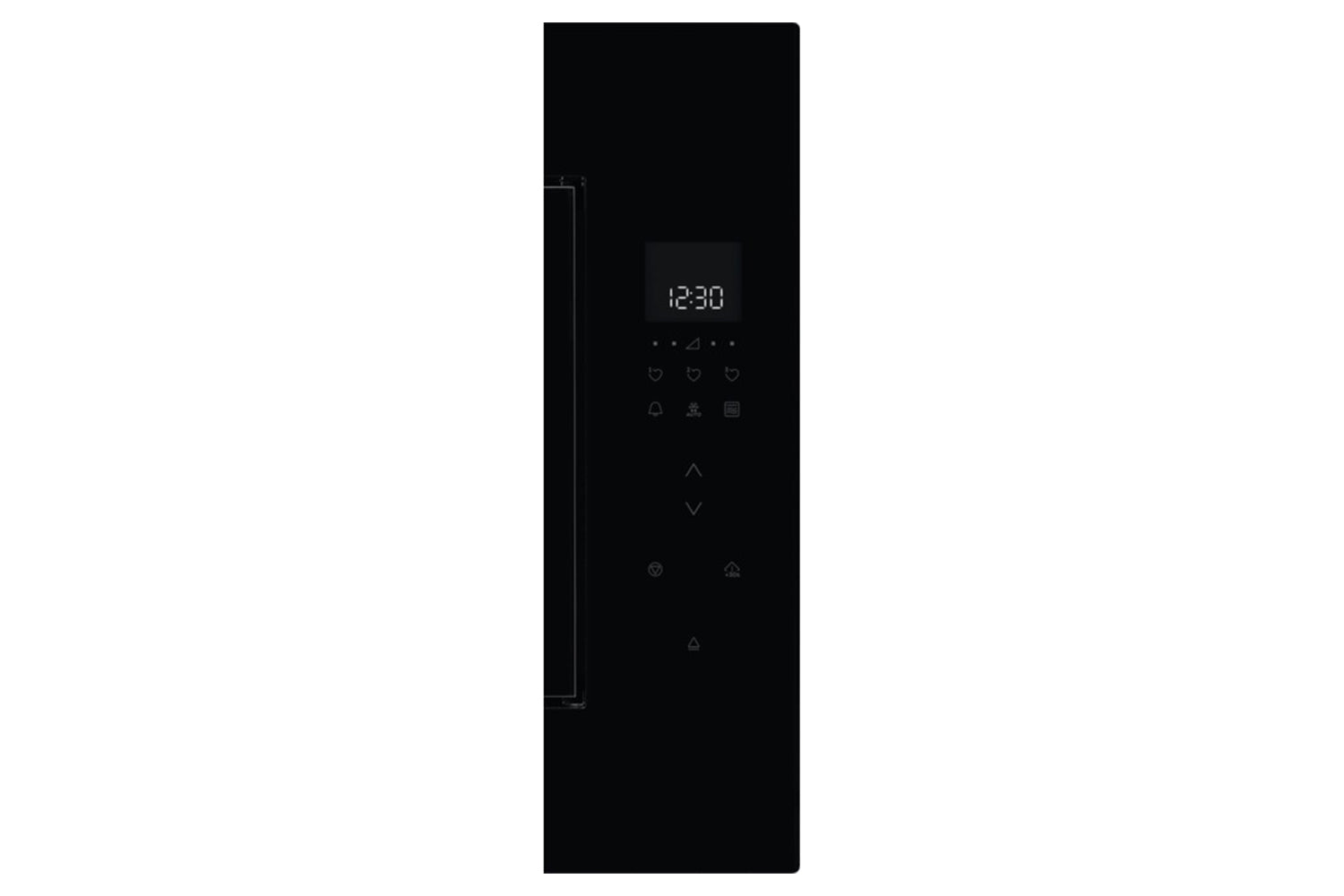 The microwave's sleek, minimalist design in high-gloss black matches the oven and other appliances.
