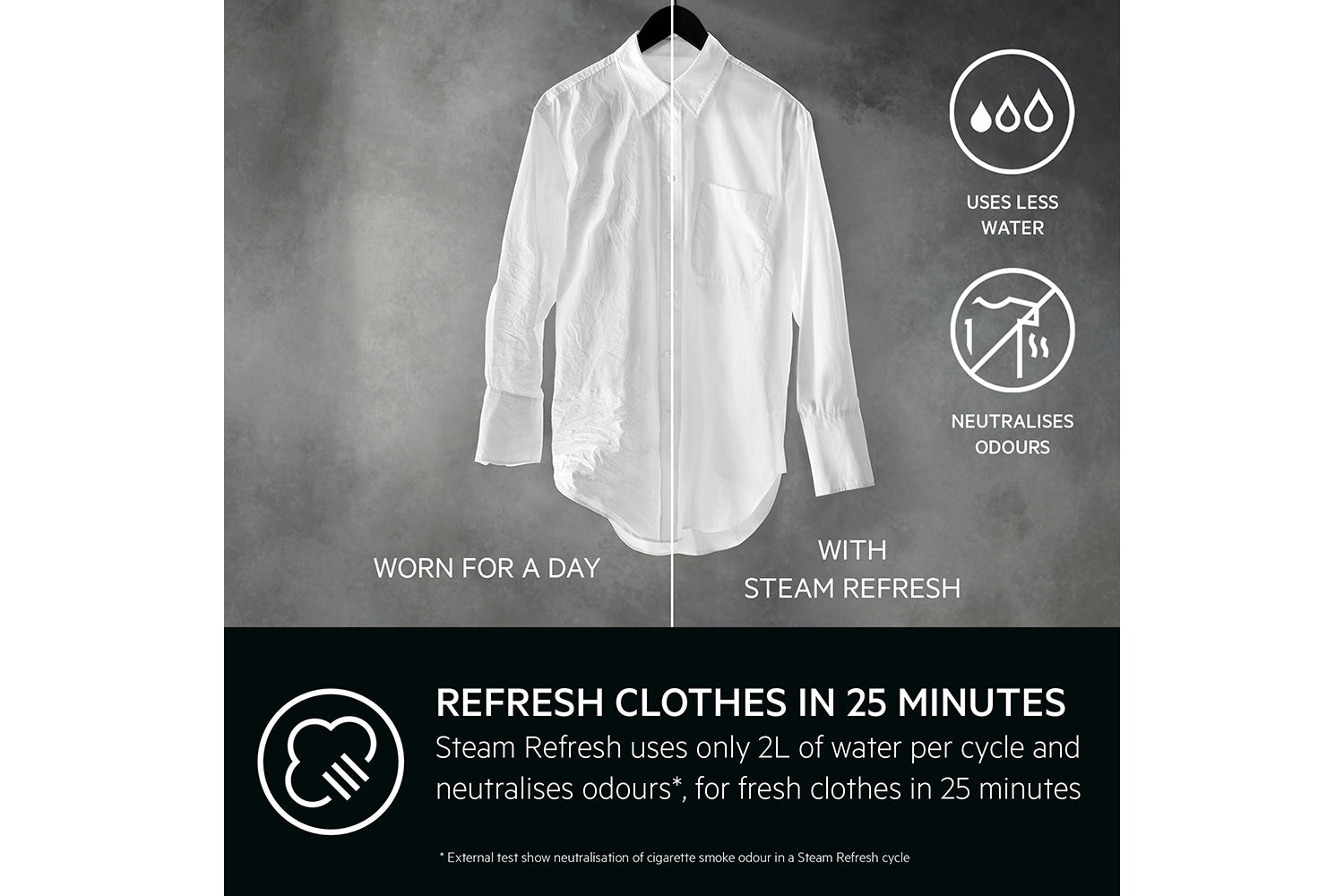 Steam Refresh neutralises odours* and reduces wrinkles on garments, including delicates, in just 25 minutes. And if you like an extra boost of freshness, just add AEG aromatic steam fragrance. Giving it that just washed freshness.