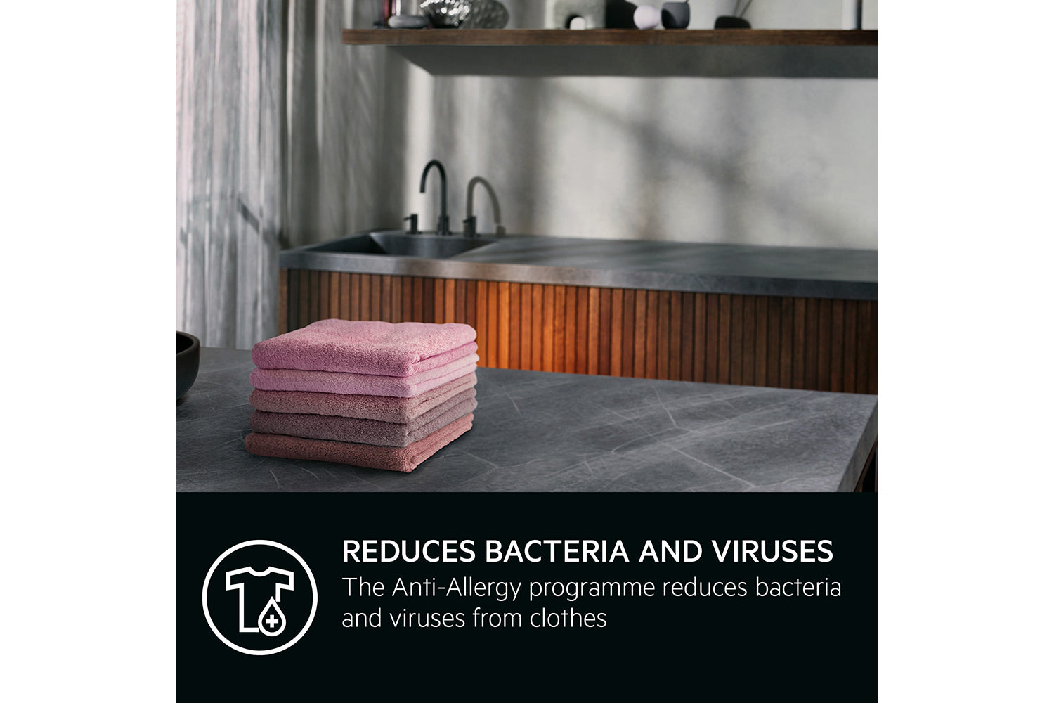 The Hygiene programme certified by Swissatest is a high-performance wash cycle that removes more than 99.99% of bacteria and viruses* from clothes. By keeping your wash temperature above 60°C, you can also reduce allergens.