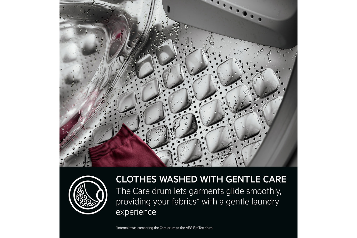 The Care drum lets garments glide smoothly thanks to its elevated cushion-like drum pattern and optimised lifter paddle. A thin film of water covers the holes during washing. Providing your fabrics with an even gentler laundry experience.