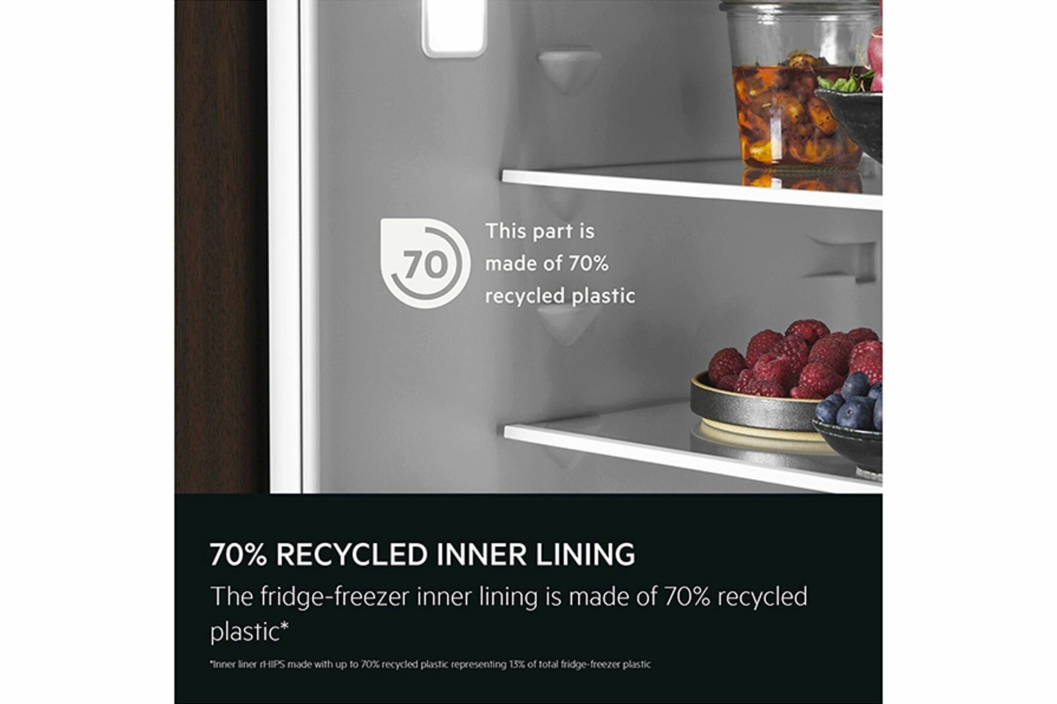 A new era of cooling is here. Introducing AEG fridge-freezer with an inner lining made of 70% recycled plastic. Plastic from discarded fridges is used to make new ones, helping reduce waste thorugh circularity.
