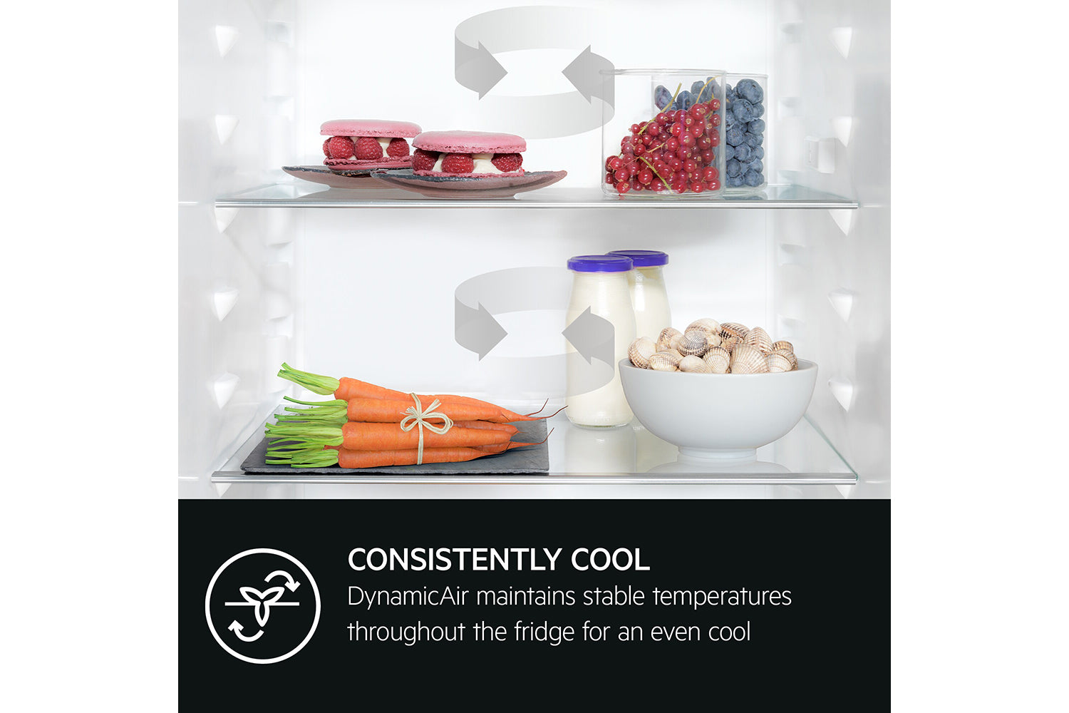 DynamicAir maintains a constant airflow to guarantee a stable temperature throughout the refrigerator. Every shelf evenly chilled to preventing warm zones. Prohibiting bacteria growth. Preserving fresh ingredients.