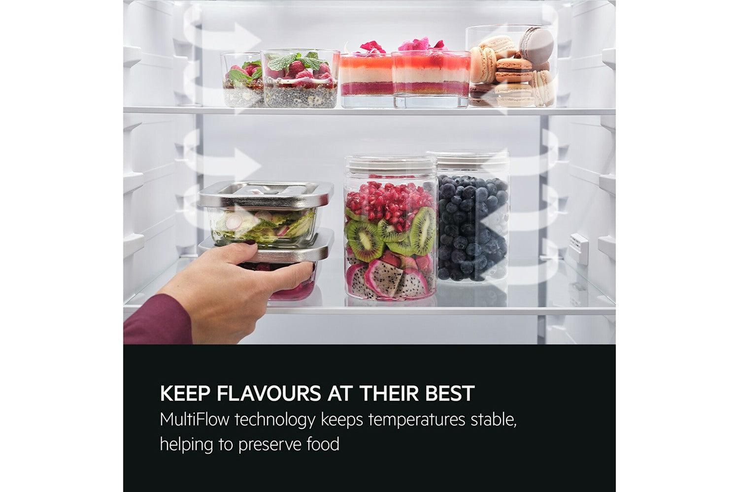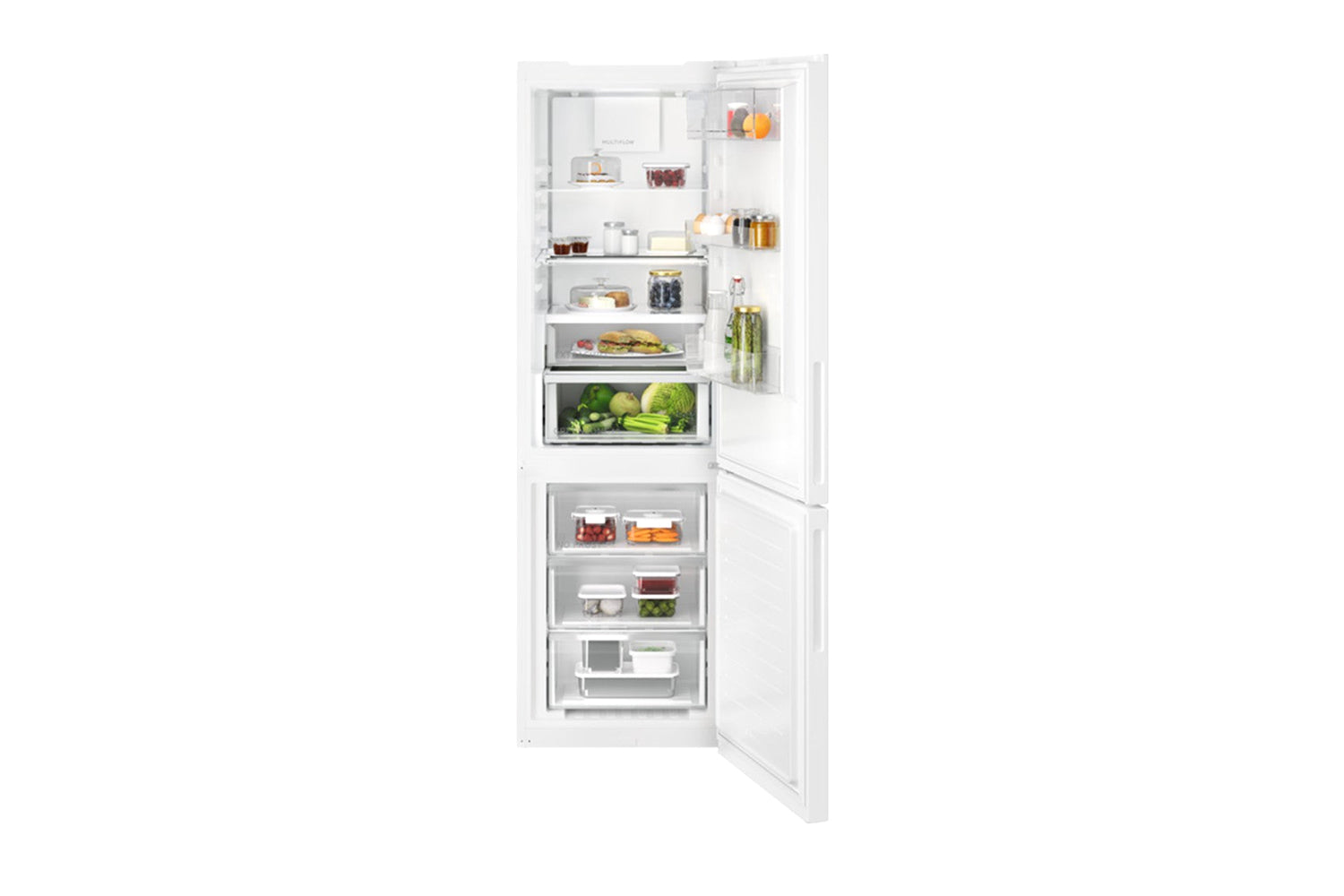 MultiFlow protects food quality by maintaining stable, even temperature and humidity. Multiple air channels in the back wall actively circulate cold air to reach every corner and allow stoarge in the back without the risk of freezing items.