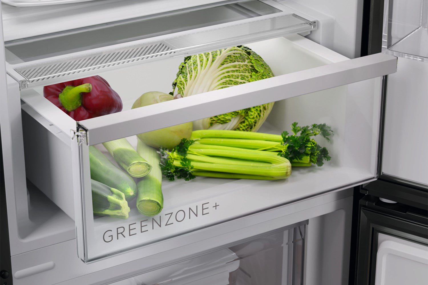 Perfect enviroment for healthy fruits and vegetables. The GreenZone+ drawer's sealing lid and humidity membrane combine to help optimise humidity and preserve fresh vegetables.