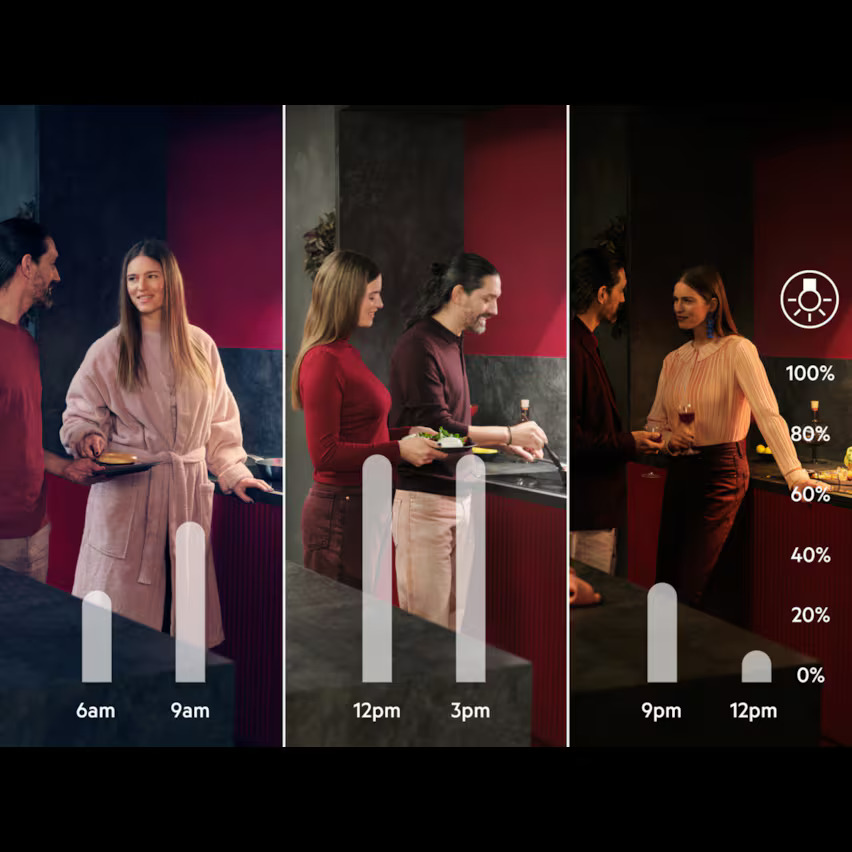 AuroraTech automatically adapts the colour and intensity of your cooker hood's light according to the time of day to create the perfect kitchen ambience and enhance your comfort. Use the app for the smart illumination experience.