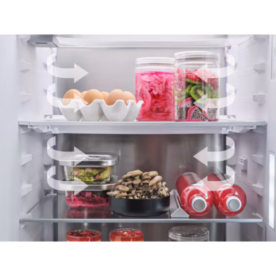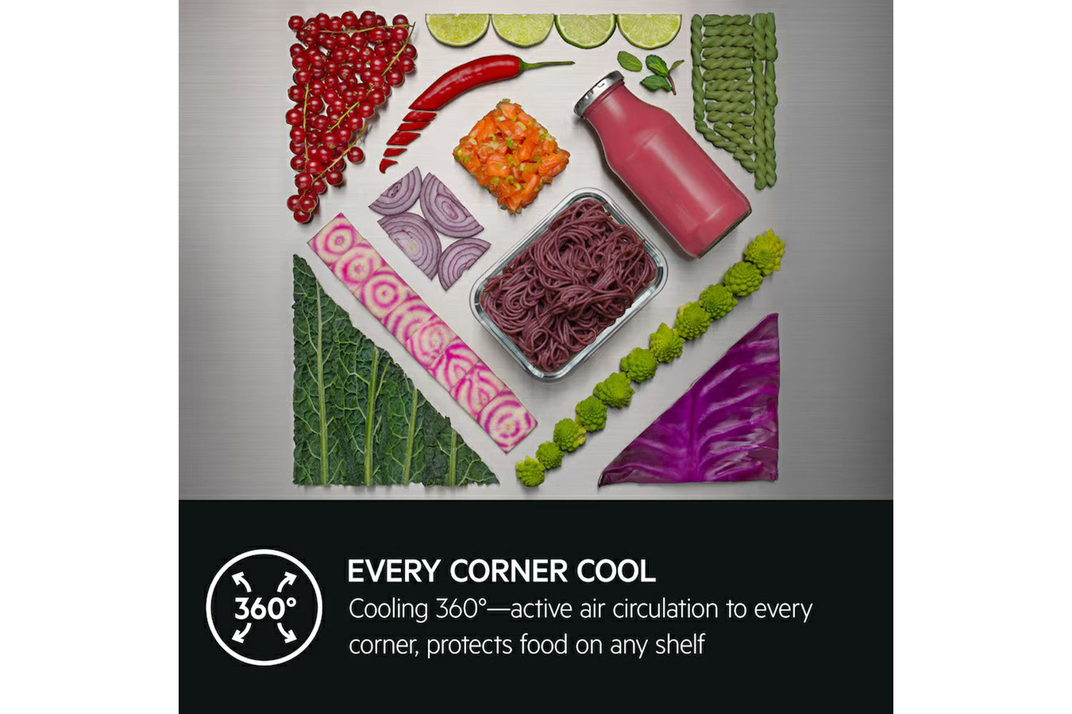 The 8000 Cooling 360° Fridge Freezer has multiple air channels to deliver consistent cooling. This protects food on every shelf. Stainless steel creates an elegant, premium look for your kitchen