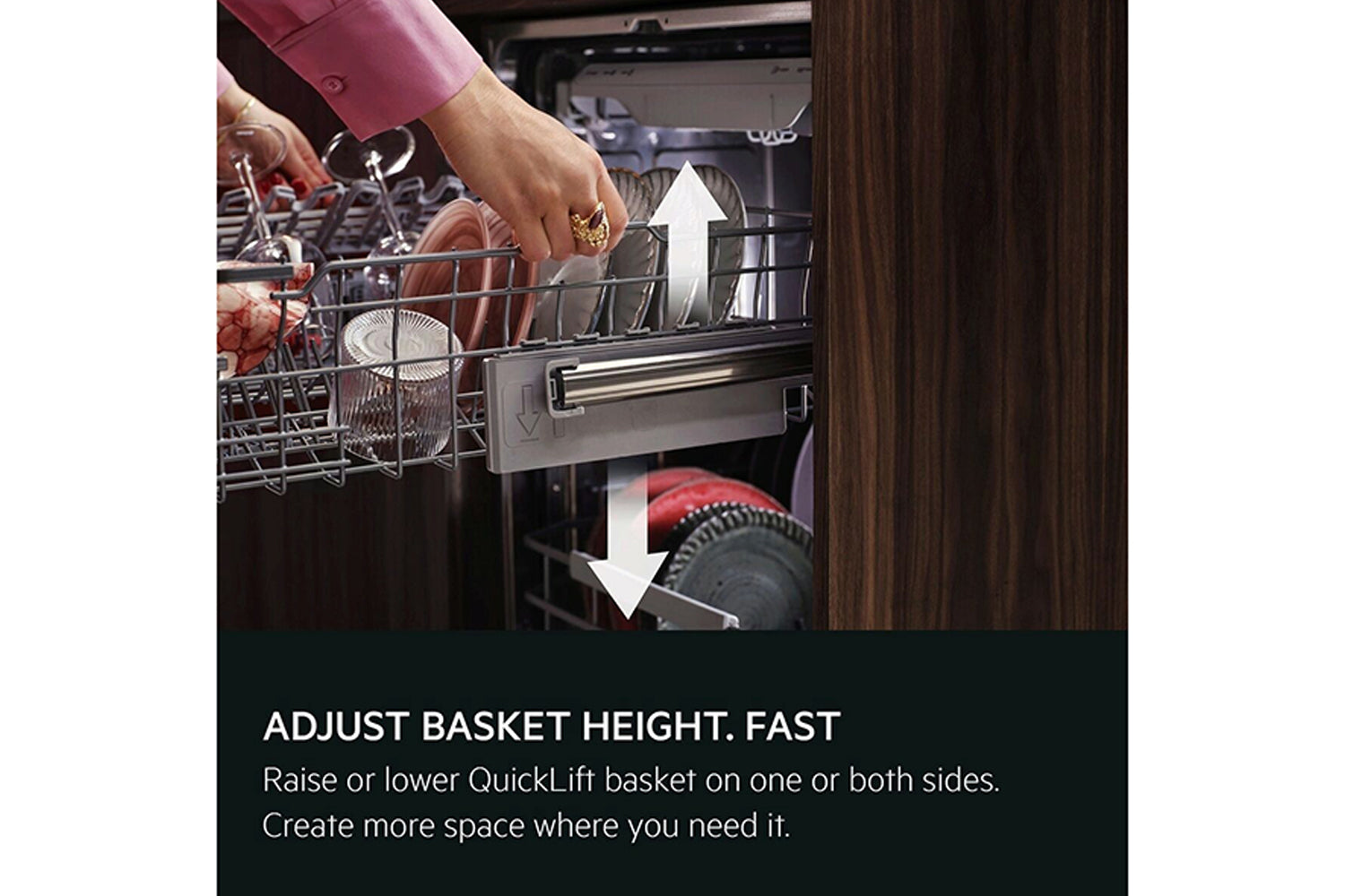 Easily create more space at the top or bottom with the height-adjustable upper basket. Simply grab the handle on both sides of the upper basket and slightly pull up to raise or lower either side or both sides.