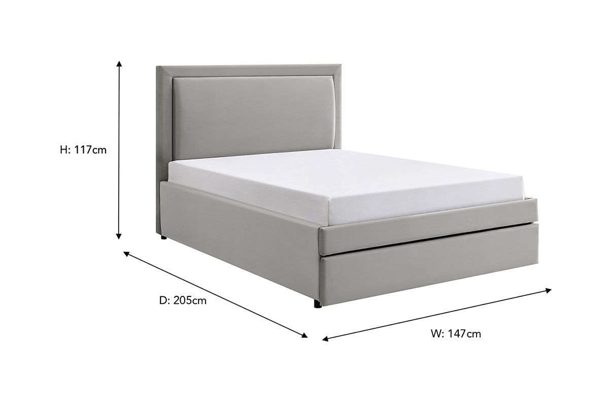 The Amy bedframe is made with quality in mind. The minimalist yet modern style will add simplicity into your bedroom giving you that finished neutral, clean look. Upholstered in a soft velvet fabric in a neutral hue, this bedframe exudes subtle sophistication while adding comfort to your space. Boasting a framed and padded headboard, it provides the perfect backdrop for relaxing mornings and late-night reading. It includes a pull-out drawer in the footboard unveiling a convenient compartment ideal for storing bed linens and other lightweight items, thereby creating additional room in your cupboards.