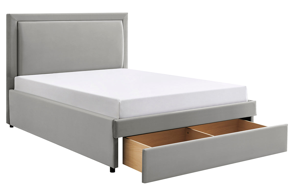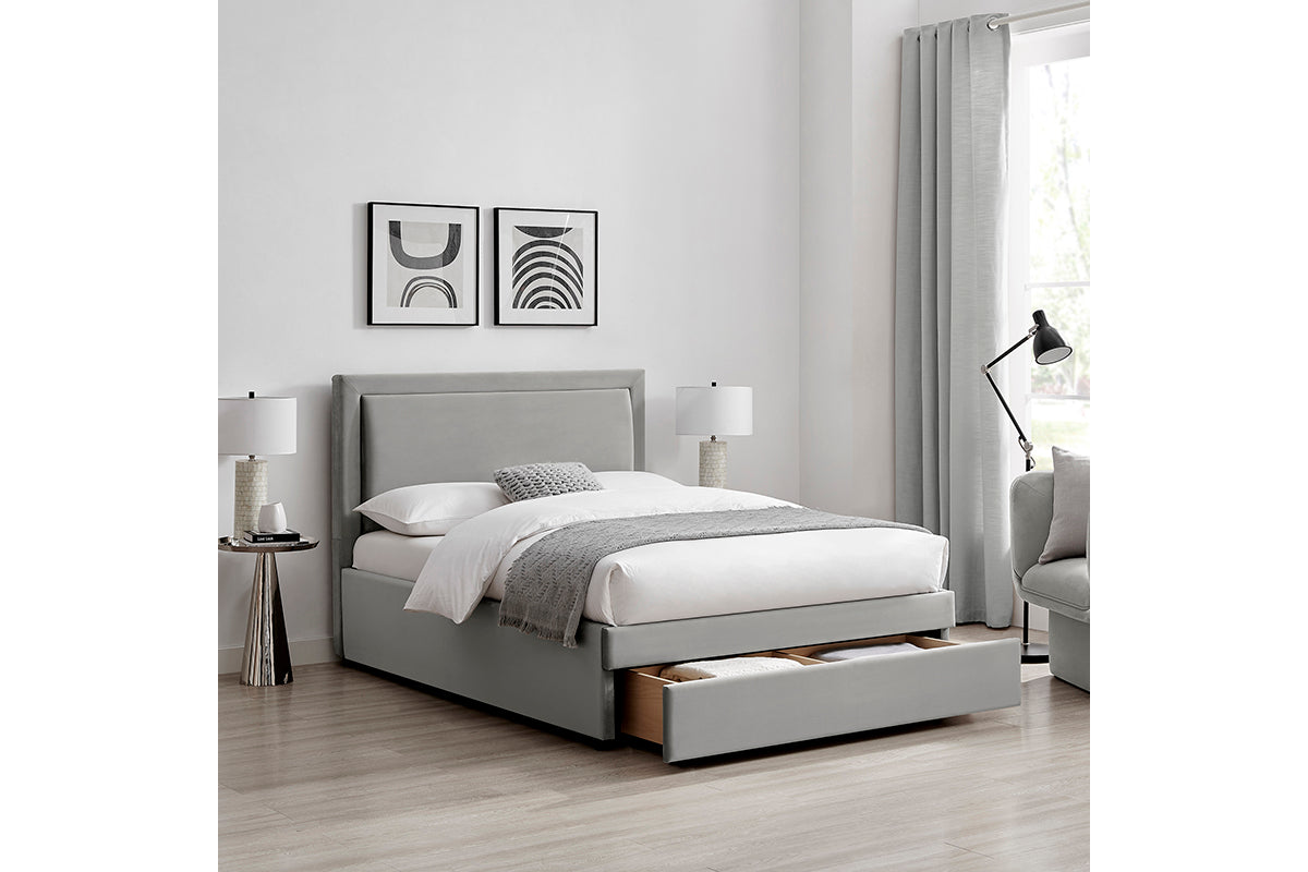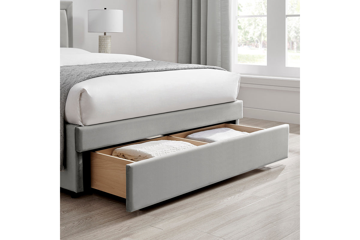 The Amy bedframe is made with quality in mind. The minimalist yet modern style will add simplicity into your bedroom giving you that finished neutral, clean look. Upholstered in a soft velvet fabric in a neutral hue, this bedframe exudes subtle sophistication while adding comfort to your space. Boasting a framed and padded headboard, it provides the perfect backdrop for relaxing mornings and late-night reading. It includes a pull-out drawer in the footboard unveiling a convenient compartment ideal for storing bed linens and other lightweight items, thereby creating additional room in your cupboards.
