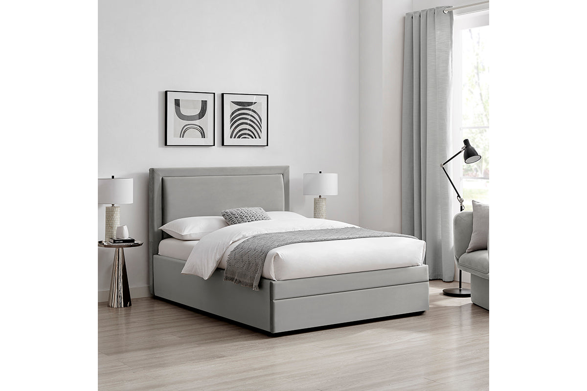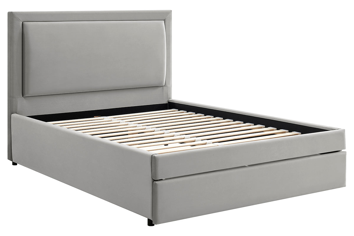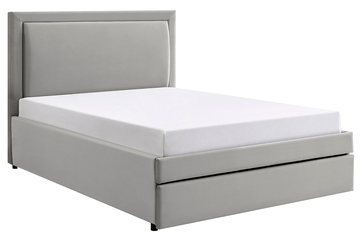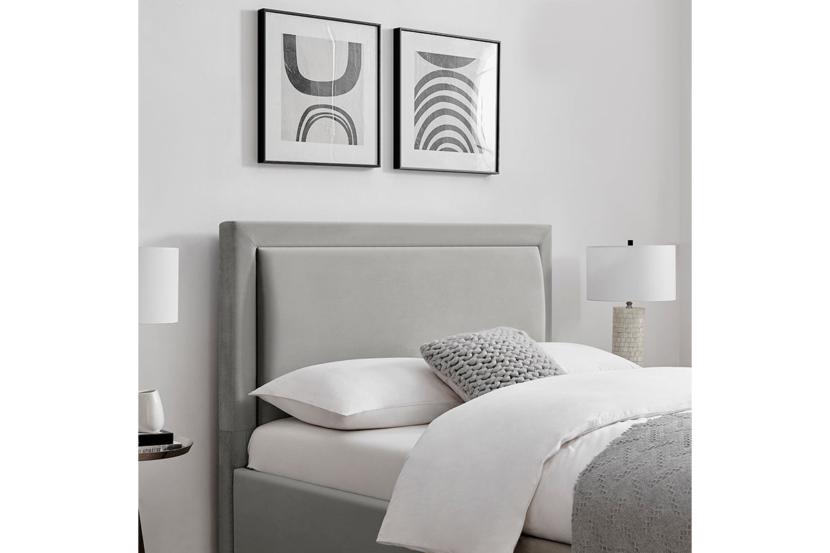 The Amy bedframe is made with quality in mind. The minimalist yet modern style will add simplicity into your bedroom giving you that finished neutral, clean look. Upholstered in a soft velvet fabric in a neutral hue, this bedframe exudes subtle sophistication while adding comfort to your space. Boasting a framed and padded headboard, it provides the perfect backdrop for relaxing mornings and late-night reading. It includes a pull-out drawer in the footboard unveiling a convenient compartment ideal for storing bed linens and other lightweight items, thereby creating additional room in your cupboards.