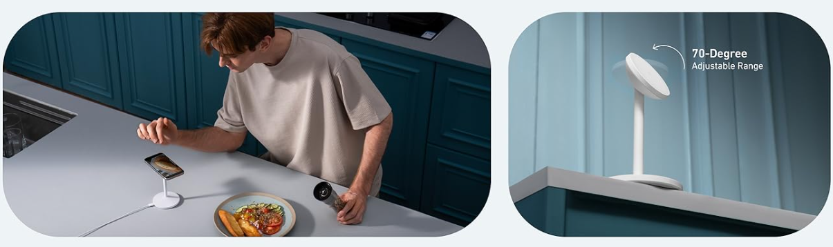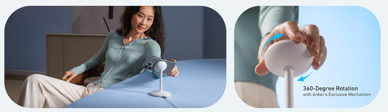 The wireless charger features a patented 360° rotating mechanism for seamless orientation changes and an adjustable tilt for the perfect viewing angle.