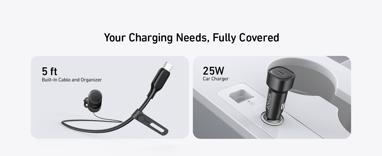 The all-in-one car charging kit comes complete with a 5 ft built-in USB-C cable, cord organizer, and a powerful 25W adapter.