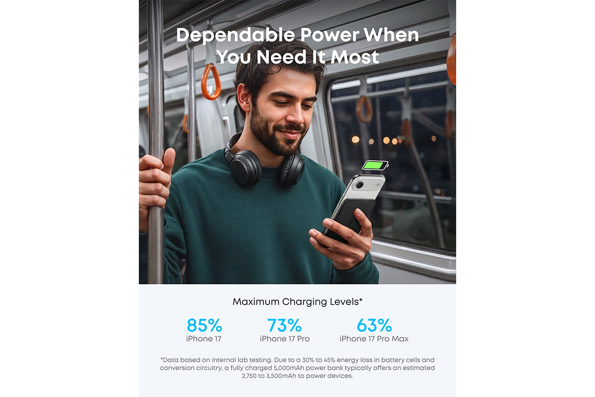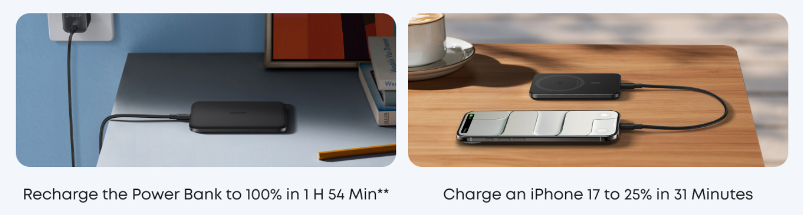 Capable of 20W bi-directional fast charging, the power bank recharges in under two hours and can quickly boost an iPhone 16 Pro to 25% in just 42 minutes, making it ideal for power on the go.