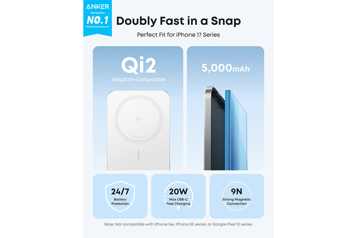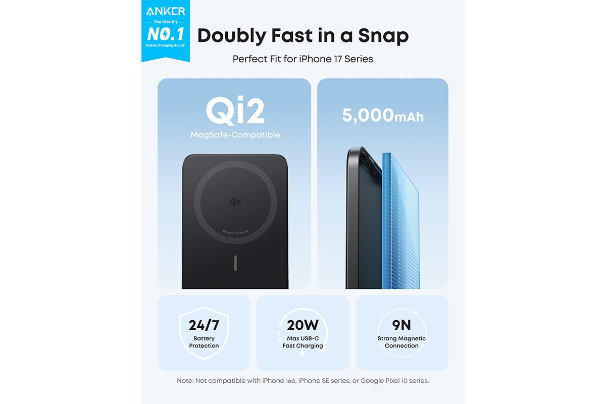 Anker high-speed charging and enhanced safety, the power bank features Qi2 MagSafe compatibility, continuous battery protection, and powerful 20W Max USB-C charging.