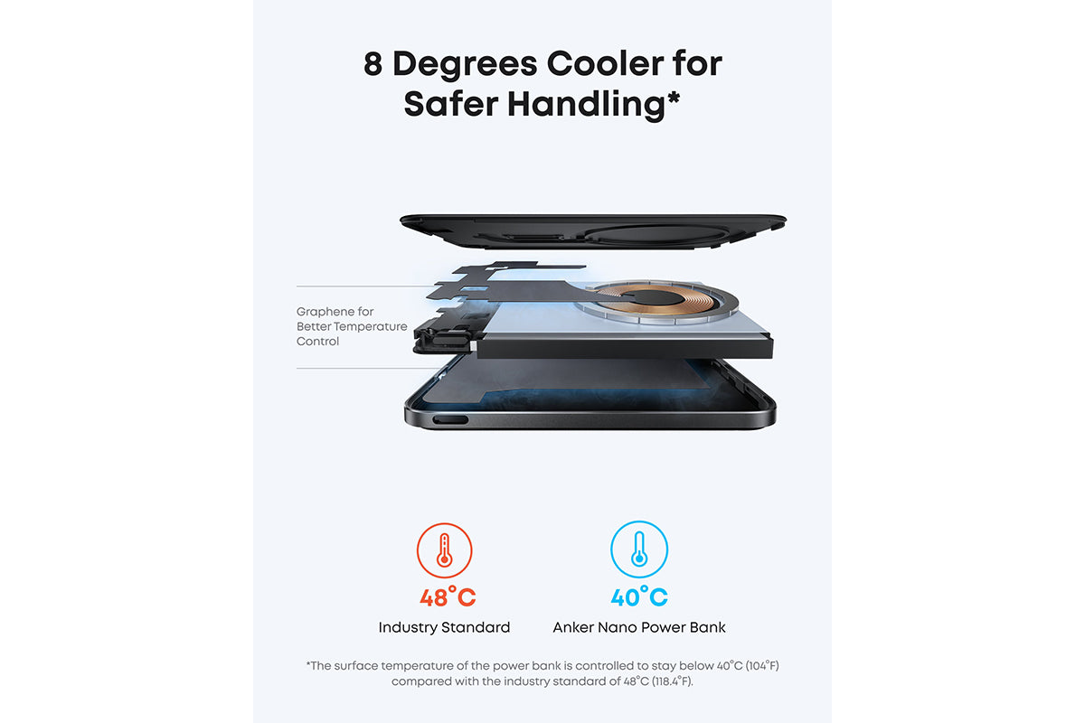 With the exceptional cooling benefits of graphene, dual NTC chips, and smart charging adjustments, this power bank stays below 104℉, 14 degrees cooler than the industry standard, for safer and more reliable charging performance.