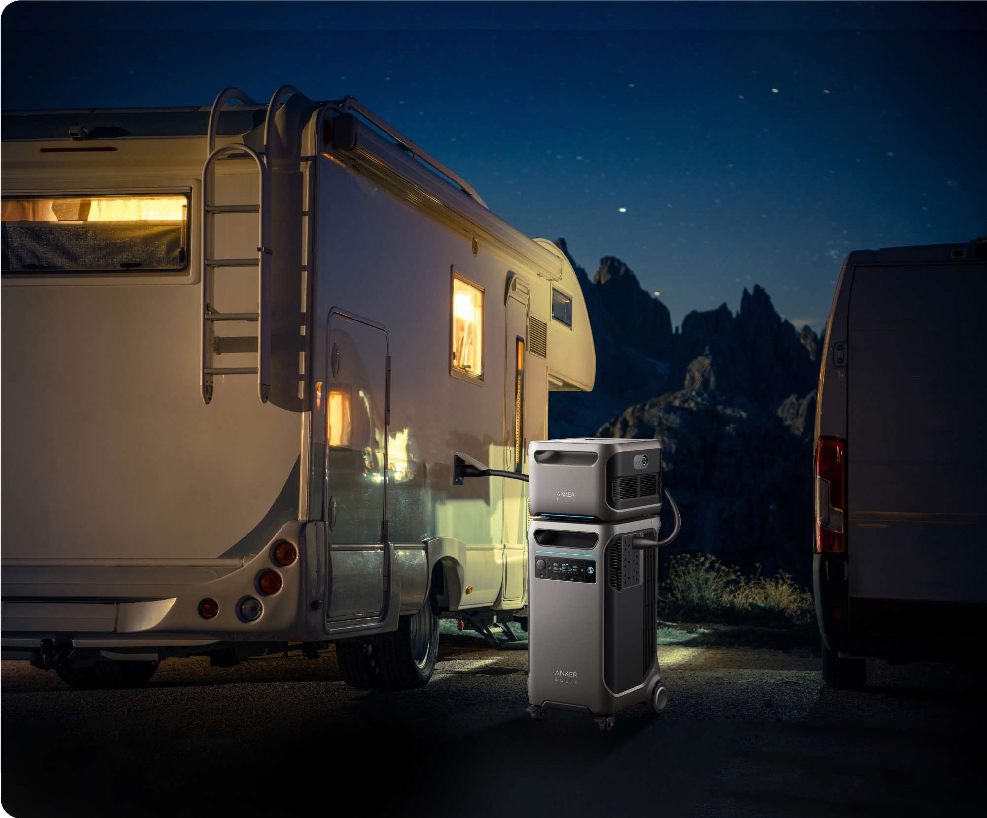 When life's on the road, you can just plug Anker Solix F3800 into your RV's power inlet to run all appliances at the same time. Enjoy 6,000W AC output and 3.84kWh capacity, worry-free.