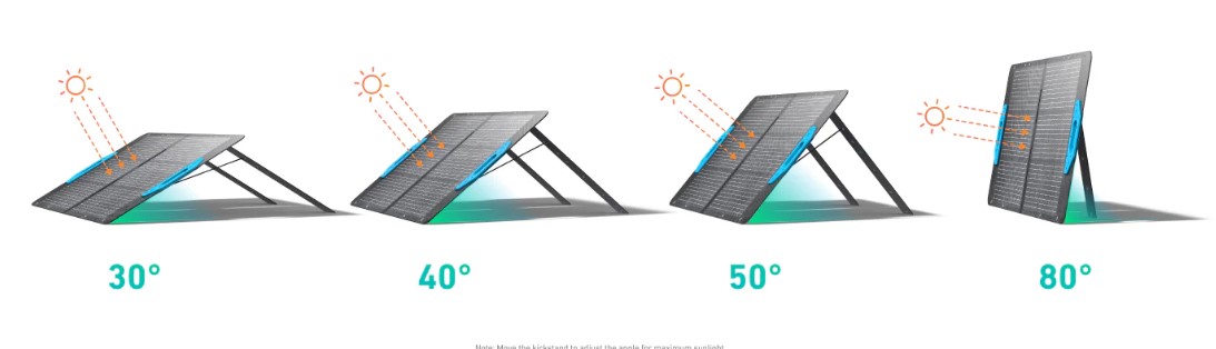 Use the stand to adjust the panels to the best sunlight angle. Set to 30 deg 40 ^ , 50 deg , or 80 deg