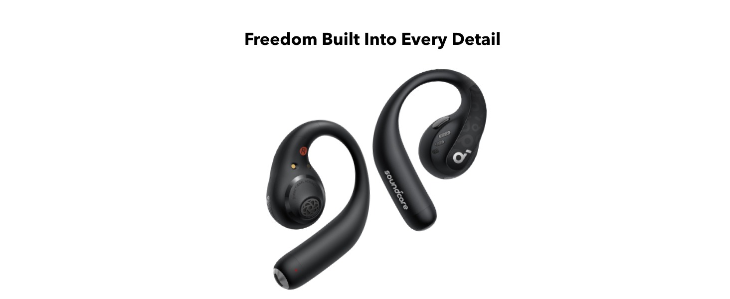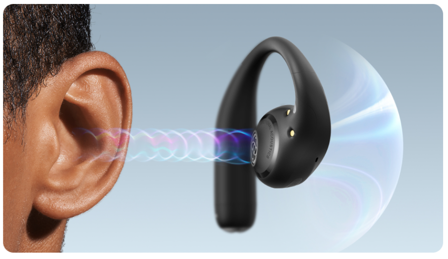 Non-intrusive design and air conduction audio work in tandem for pressureless listening and air-like comfort.