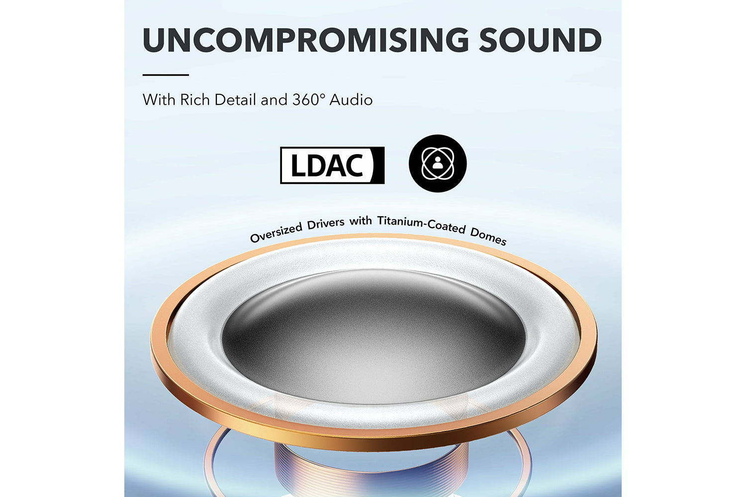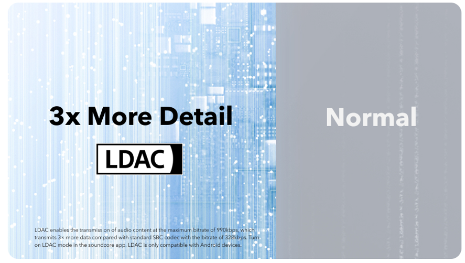 LDAC enables the transmission of audio content at the maximum bitrate of 990kbps, which transmits 3x more data compared with standard SBC codec with the bitrate of 328kbps. Tum on LDAC mode in the soundcore app. LDAC is only compatible with Android devices.