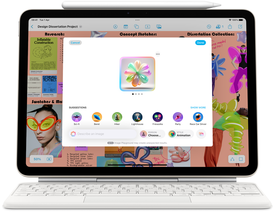 Apple Intelligence enables delightful ways to express yourself visually. Turn a rough sketch into a related image with Image Wand. And create new images based on descriptions, suggested concepts and even a person from your Photos library with Image Playground.
