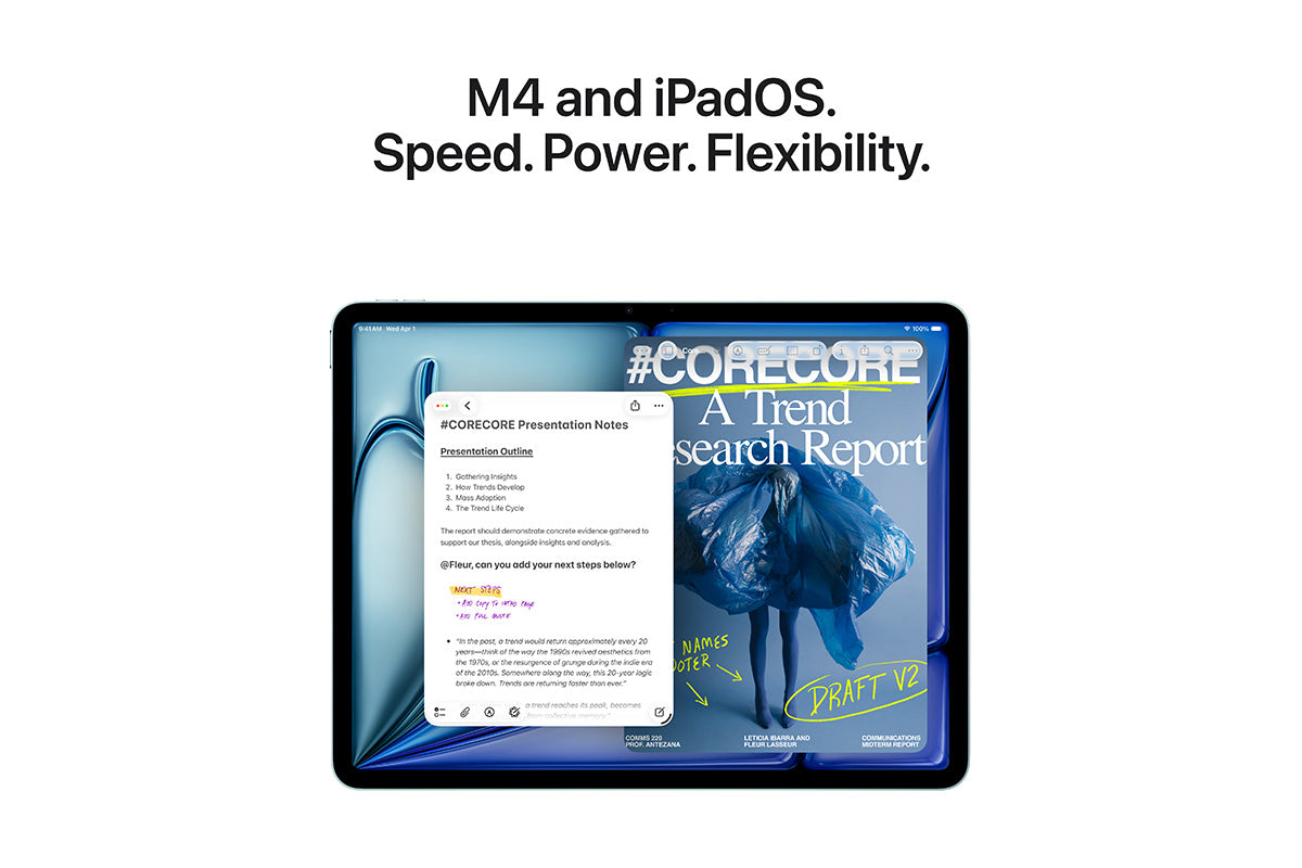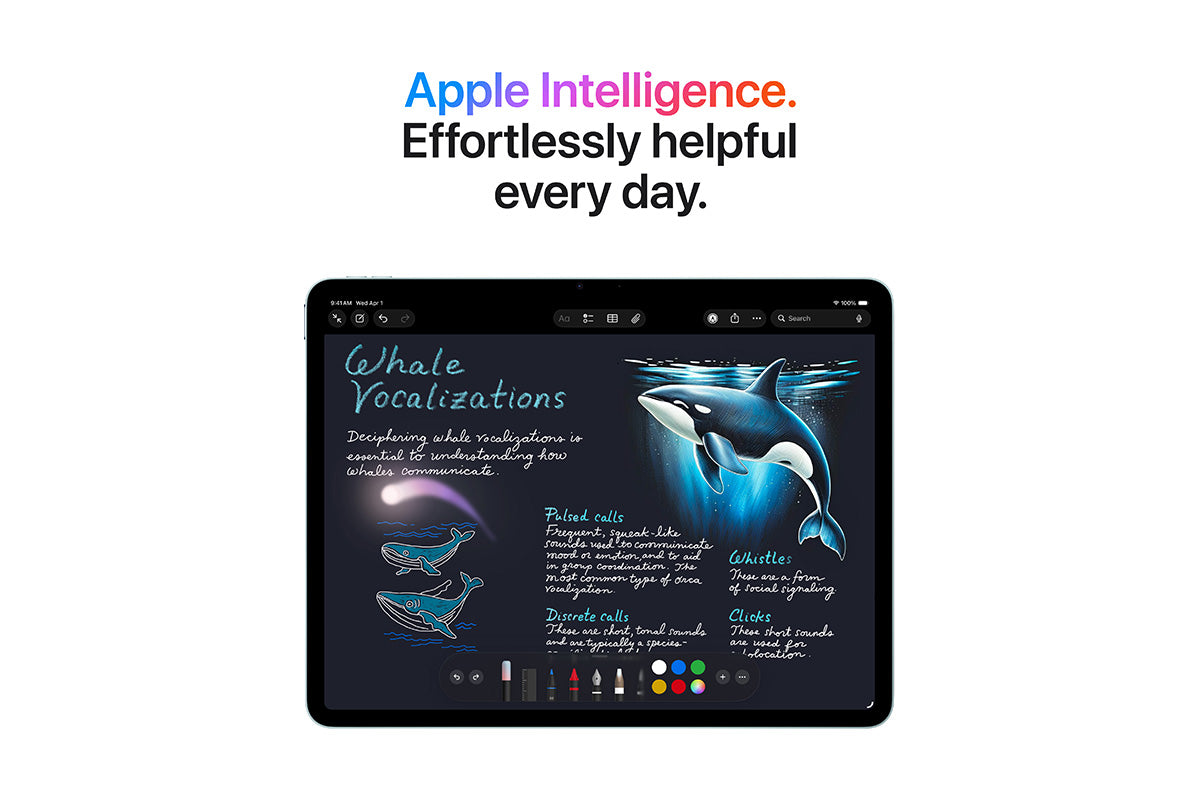 The 13 inch iPad Air. Built for Apple Intelligence.1 iPad Air, now supercharged by the Apple M4 chip. Powerfully capable and affordable. It features a stunning Liquid Retina display, a 12MP Center Stage front camera for great video calls, iPadOS, and blazing-fast Wi-Fi 7.2 And it works with Apple Pencil Pro, Magic Keyboard for iPad Air and more, so you can multitask, study, work, play and create with ease.