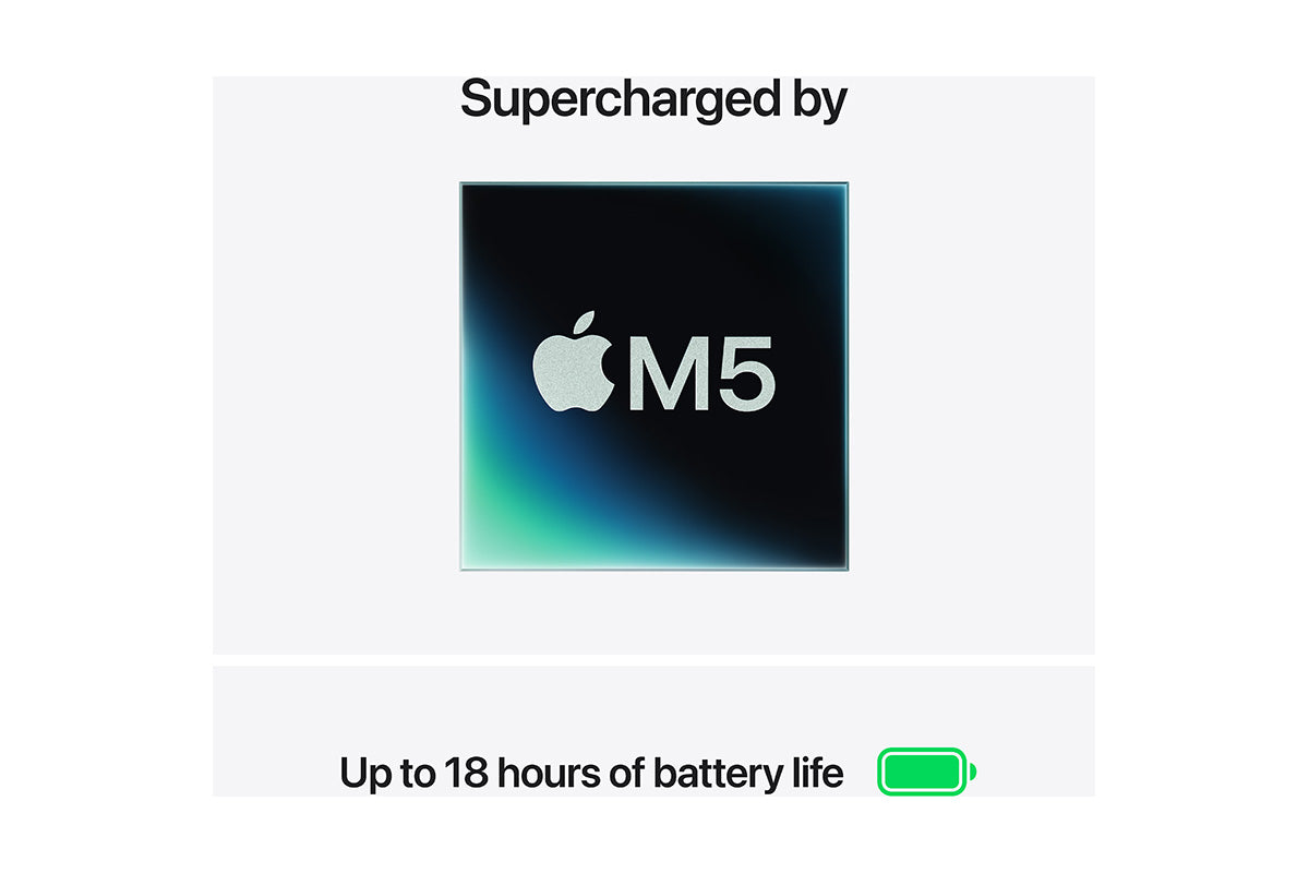 2Testing conducted by Apple in January 2026 using pre production 13 inch MacBook Air systems with Apple M5, 10 core CPU and 8 core GPU, and pre production 15 inch MacBook Air systems with Apple M5, 10 core CPU and 10 core GPU, all configured with 16GB of unified memory and 512GB SSD. Wireless web battery life tested by browsing 25 popular websites while connected to Wi Fi. Video streaming battery life tested with 1080p content in Safari while connected to Wi-Fi. All systems tested with display brightness set to 8 clicks from bottom and keyboard backlight off. Battery life varies by use and configuration. See apple.com/ie/batteries for more information.