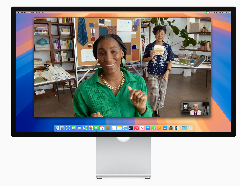 12MP Ultra Wide camera with Centre Stage. Studio Display includes a highly advanced camera with a 12MP sensor and a 122‑degree field of view. And thanks to Apple silicon, it features Centre Stage, which comes to Mac for the first time. Centre Stage keeps you centred in the frame as you move around, making video calls more engaging. When others join or leave the call, the view expands or zooms in. It also works beautifully with your favourite video conferencing apps.