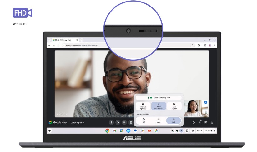 An FHD webcam ensures high-quality visuals for online conferences, video calls, hybrid-learning and taking photos. With privacy in mind, this high-resolution eye can be quickly hidden behind a retractable cover. Simply slide it open when you need the camera, and close it again when you’re finished! And, Chromebook Plus has built-in AI-powered video call tools that automatically enhance clarity and lighting, cancel noise, and blur backgrounds, so you’ll always look and sound your best, no matter what app you use.