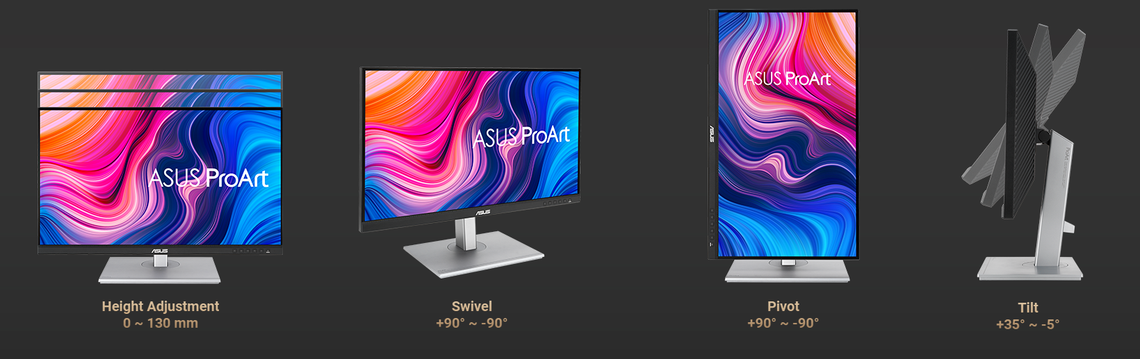 With an ergonomically-designed stand with tilt, swivel, pivot and height adjustments, ProArt displays provide comfortable viewing and usage experiences. The ability to pivot the screen clockwise or counterclockwise 90 degrees for use in portrait mode comes in handy when working with long documents, coding or website browsing. Furthermore, the quick-release stand makes it easy to attach the display via the integrated VESA wall mount – screw-free, so it’s done in seconds!