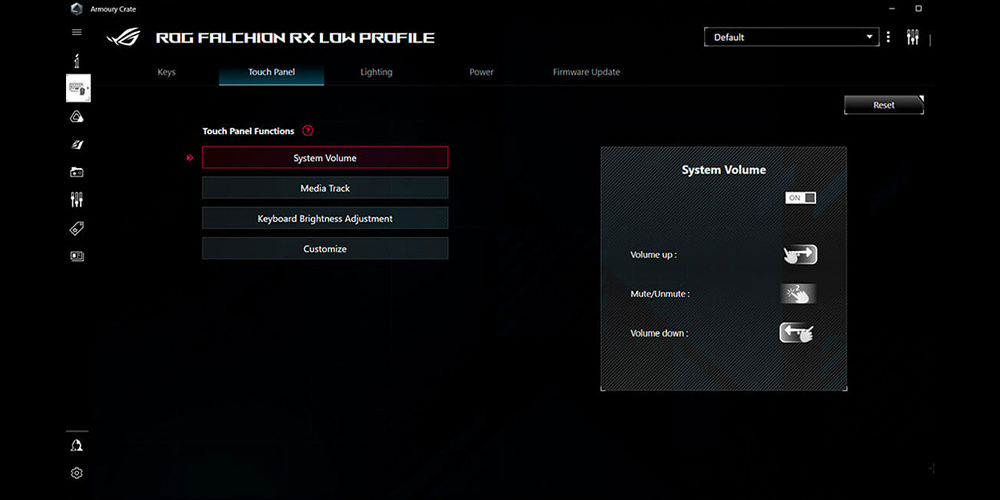A multi-function switch paired with an interactive touch panel allows users to adjust volume, control media playback, tweak keyboard lighting, and further control customization such as zoom in & out is available via the Armoury Crate software. The LED indicators show real-time adjustment.