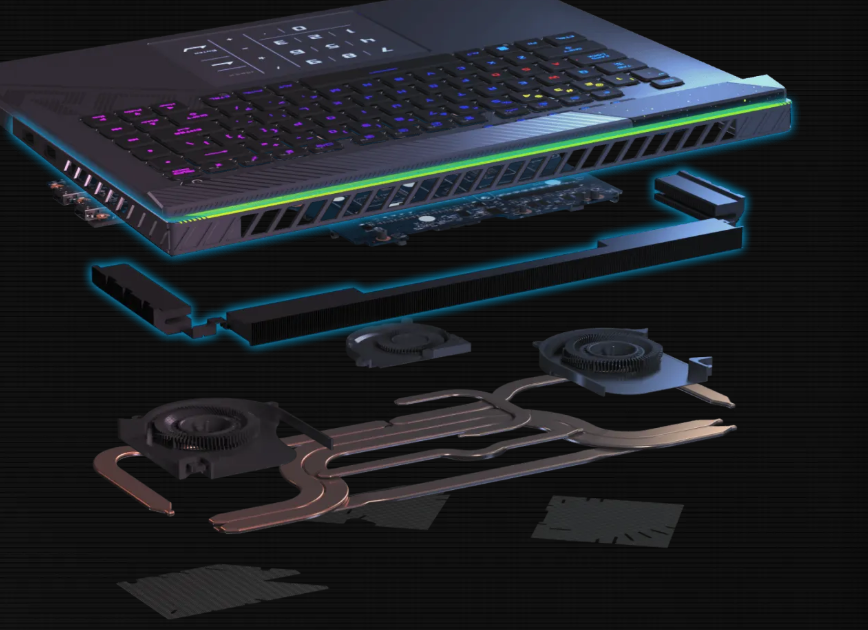 The Strix G16's comprehensive thermal design includes an extended heat spreader that absorbs heat from the CPU, GPU, VRAM, and VRM. With 7 heatpipes and an increase in total coverage from 26% to 33% of the motherboard compared to the previous design, this extensive thermal solution helps sustain and extend the overall performance, reliability, and lifespan of the system.