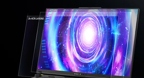 This year, ASUS added two layers of Ambient Contrast Ratio film to the display, which reduces reflections by 55% and provides up to 4.5x better contrast, ensuring the image stays punchy, vivid, and accurate. A second layer boosts viewing angles for a 180° ultra-clear view, providing an image that looks just as good off-center as it does straight on. This machine doesn't just perform at a high level - it draws you into the visuals, with colors so realistic it's as if you were right in the middle of the action.