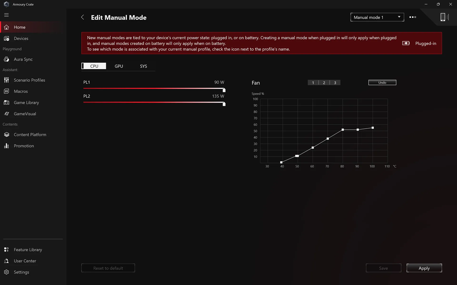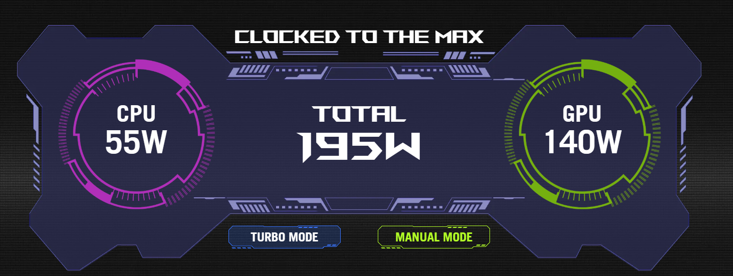 More than just simple fan curves, Armoury Crate's performance modes serve to transform your machine from a silent, power sipping web browser to a full gaming battlestation with maximum horsepower. And for those that require even more granular control, Manual mode removes all limiters and lets you make a custom profile that suits your exact needs.
