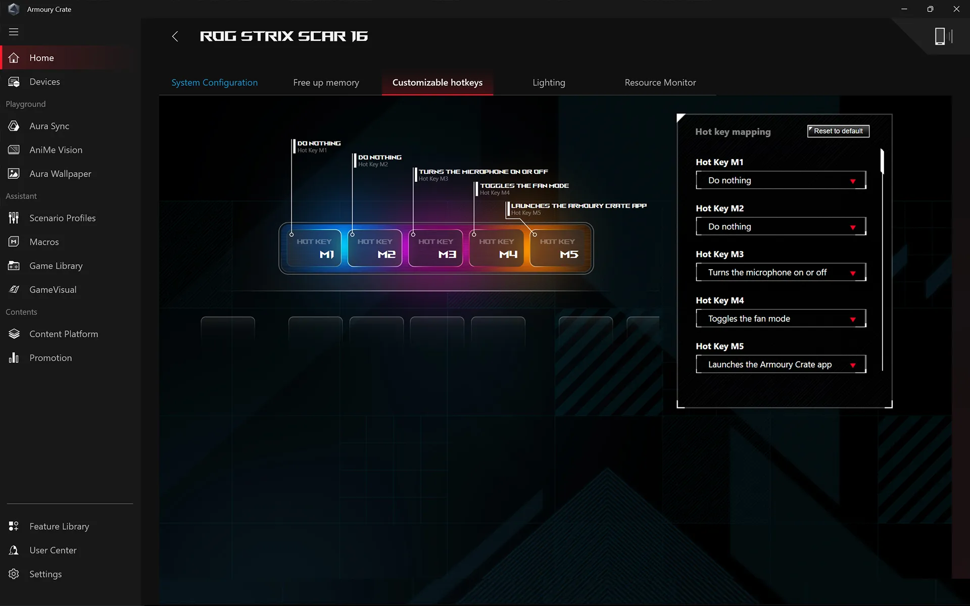Armoury Crate also supports full customization of the dedicated hotkeys. By default they act as volume control, microphone mute and a quick launch for Armoury Crate, but with a few adjustments you can make them work for you. Create a function key for quick toggle when needed, a macro for complicated button combinations, or even a quick launch button for the application of your choice. Make your machine uniquely yours.
