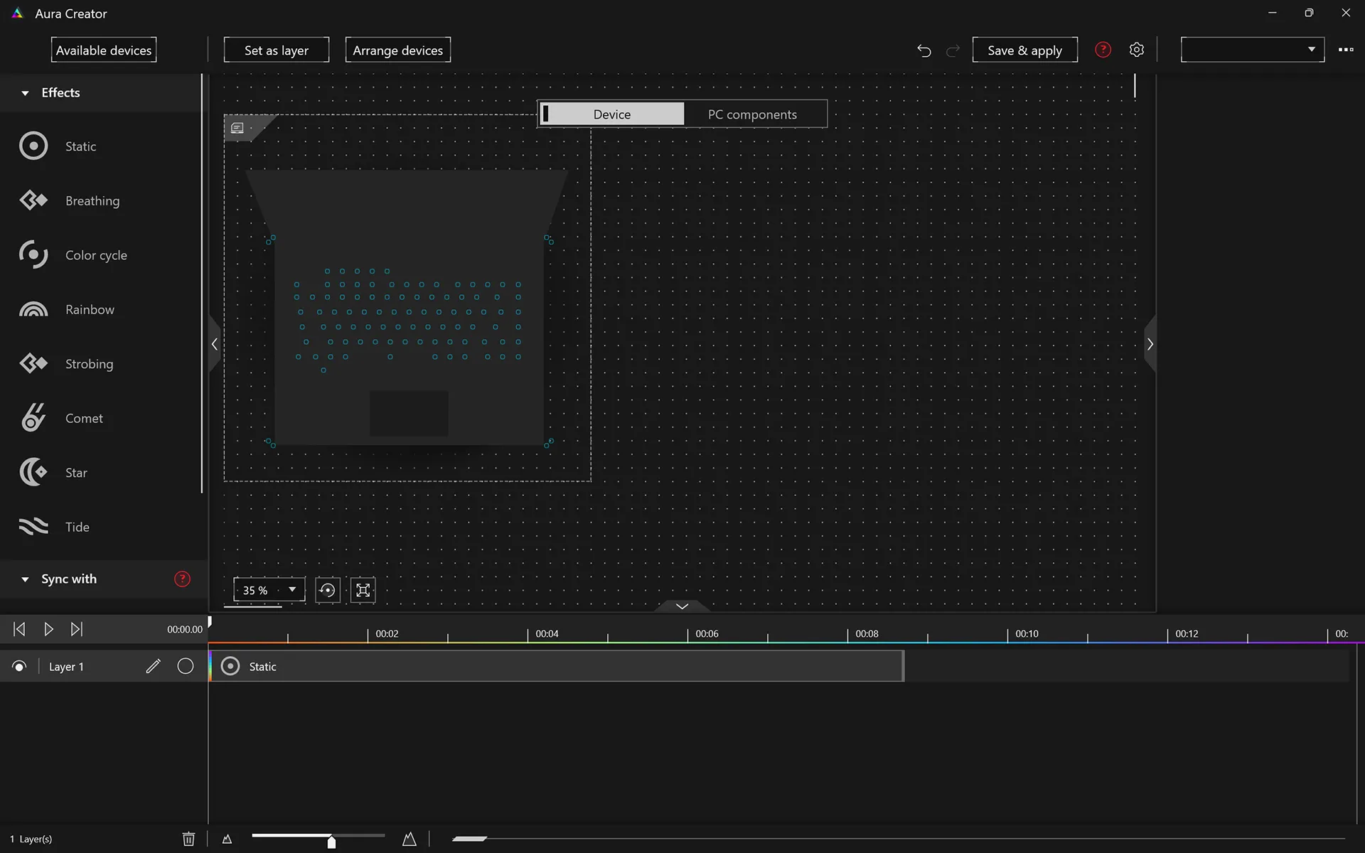 Customize the RGB lighting on Aura-compatible peripherals to suit your gaming style. Aura Creator's easy-to-use control panel allows you to alter a brilliant spectrum of lighting effects and colors, in addition to swapping preset lighting modes, you can also activate Aura Sync to match colors and effects across multiple devices.