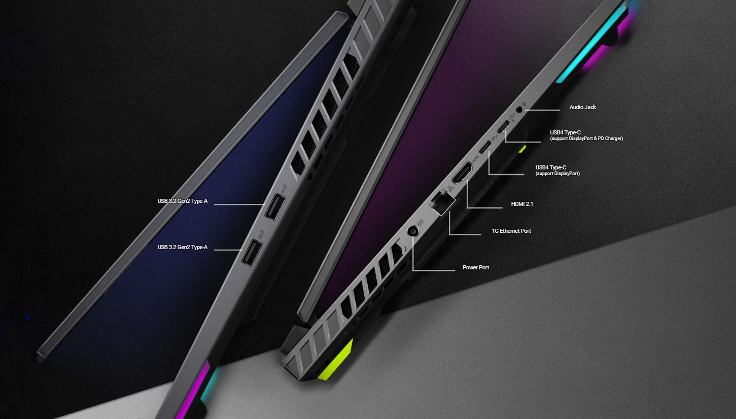 The Strix G16 supports dual USB4 ports, offering incredible flexibility and versatility. Both of these ports also support DisplayPort 1.4 with G-SYNC, offering a simple yet powerful connection to an external display. The 40Gbps transfer rate allows for up to a 4K 120Hz signal, and also supports PCIe tunneling, unlocking the ability to leverage external GPUs and other high-speed peripherals. USB4 is also fully compatible with Thunderbolt 3, giving you access to a wide range of high throughput devices.