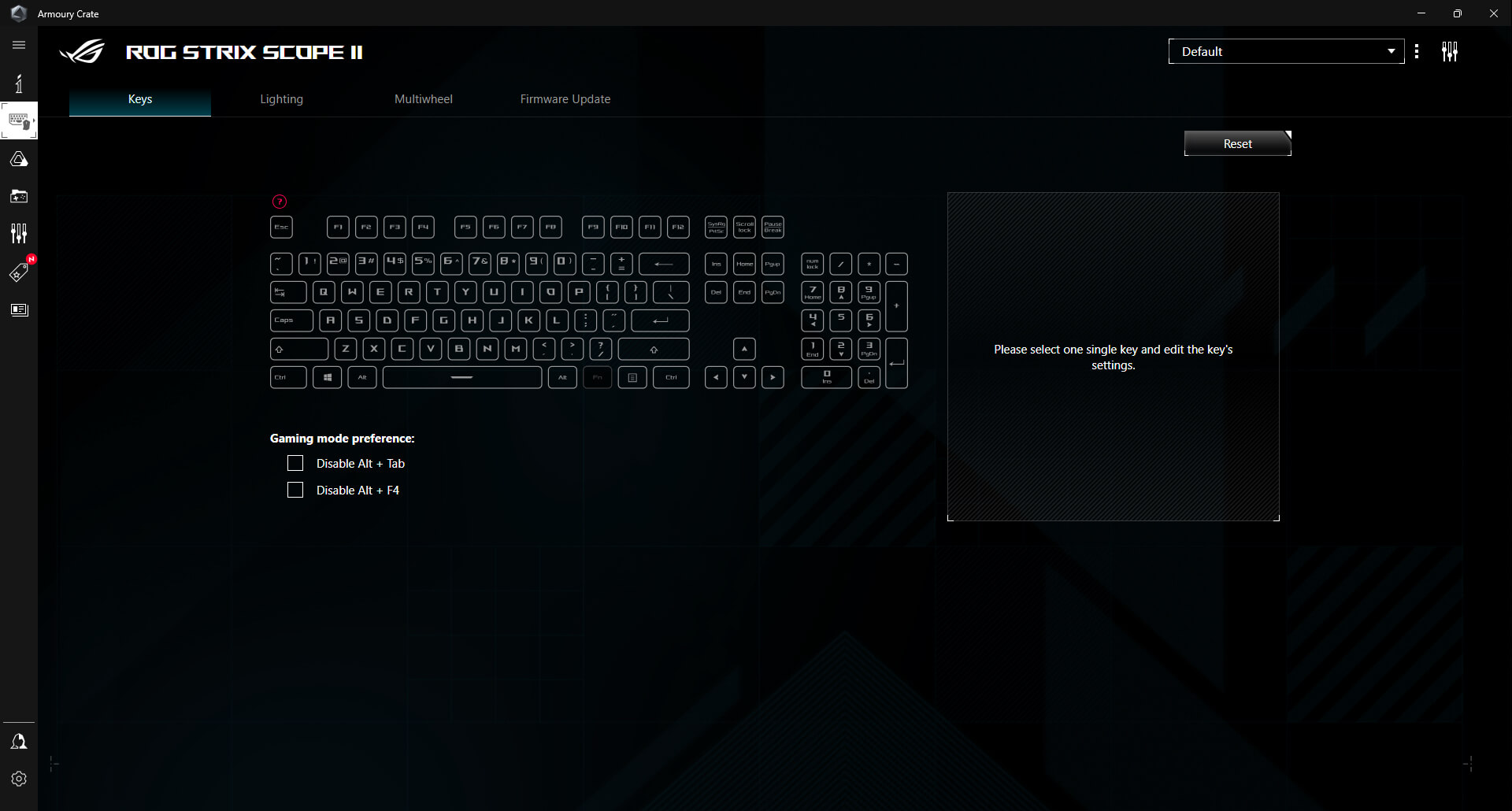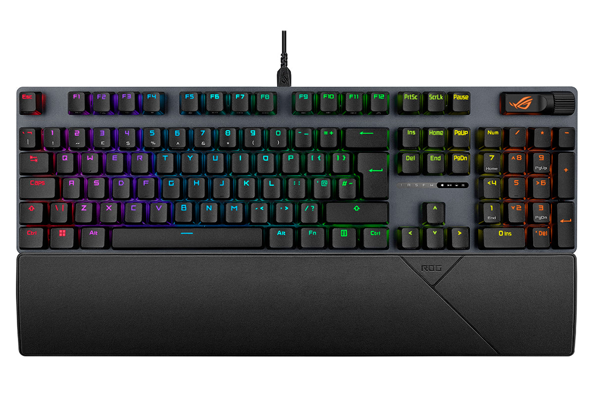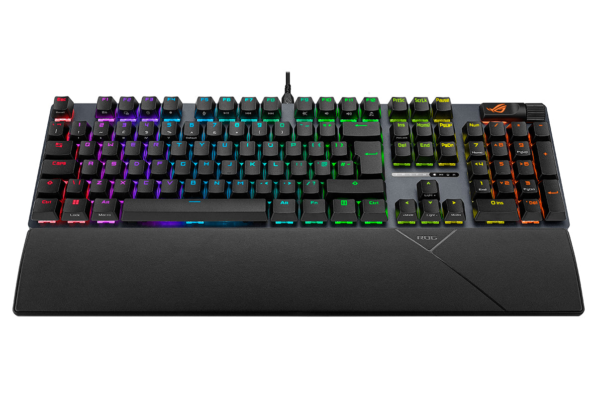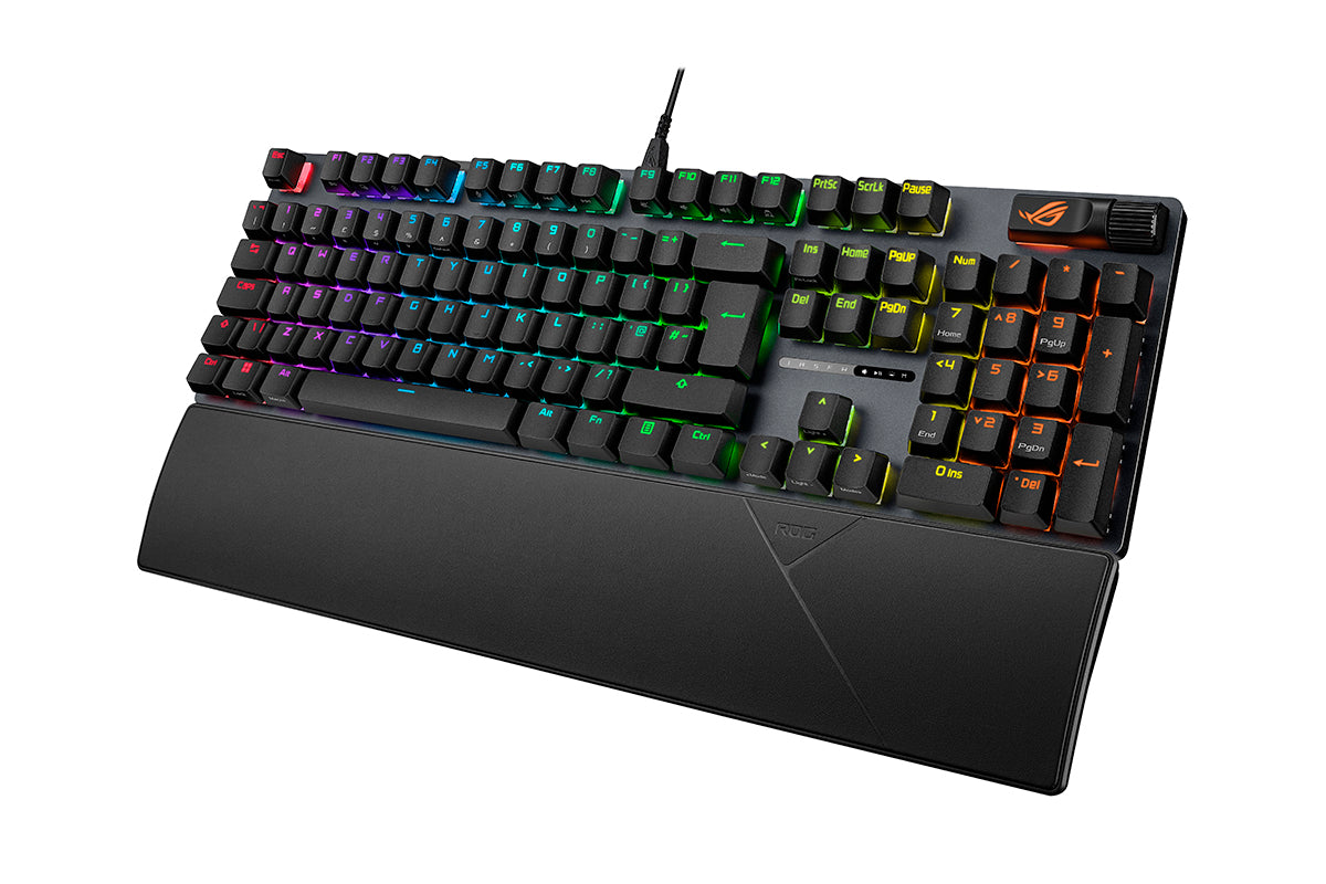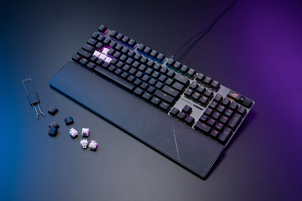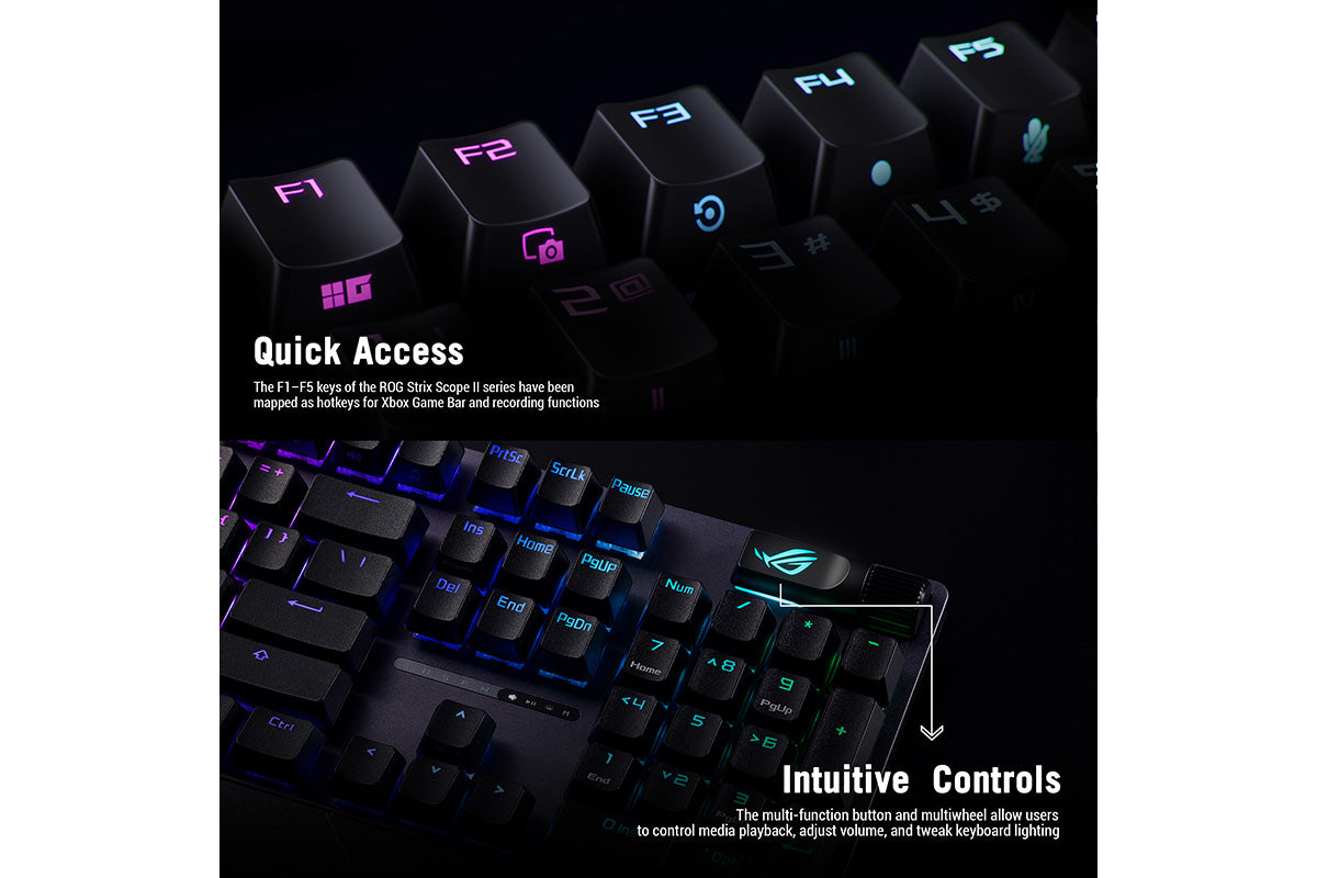 ROG Strix Scope II X is an all-round battlestation, featuring hot-swappable ROG NX Mechanical Switches V2 with refined tuning, durable PBT doubleshot keycaps or UV-coated ABS keycaps for a premium feel and shine resistance, multi-function quick controls, streaming hotkeys, and a detachable wrist rest for enhanced comfort.