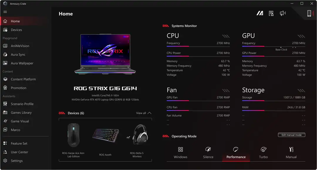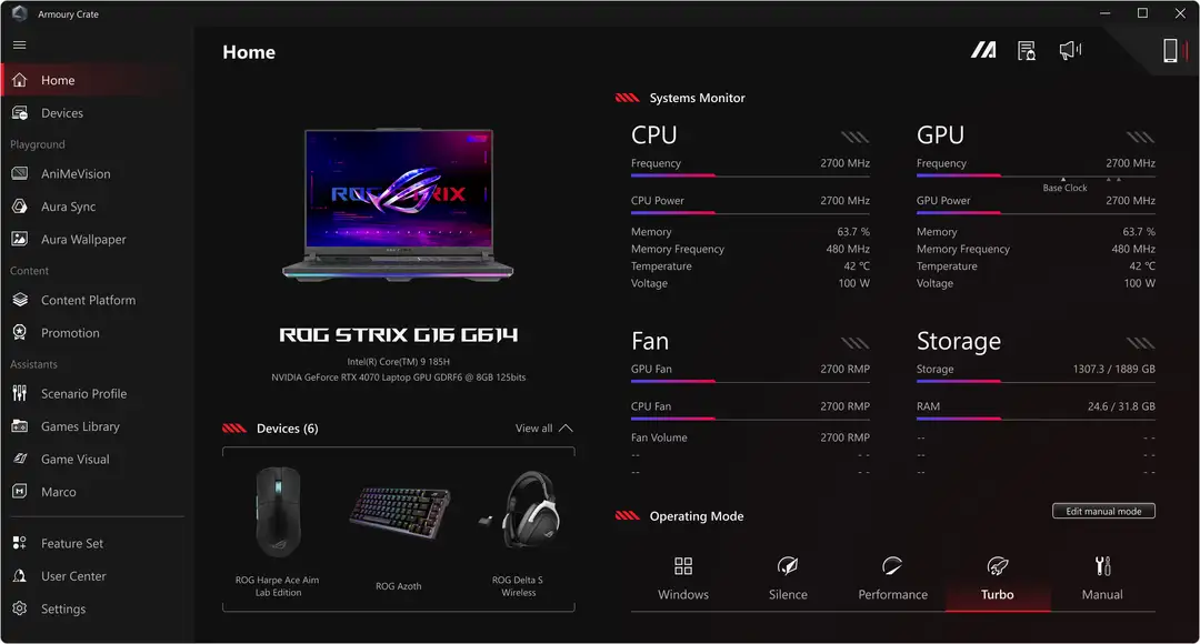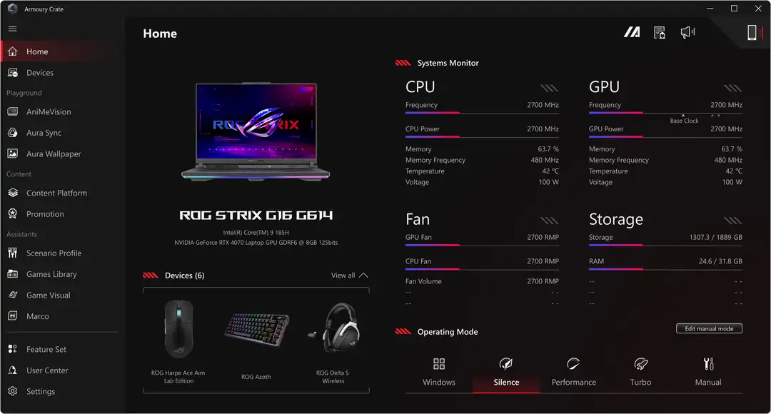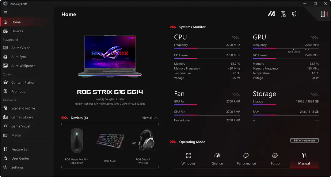 When you want to tweak settings, monitor temperatures, or tinker with your laptop, Armoury Crate is your command center. Real-time monitoring allows you to see what your GPU, CPU and memory are doing. RGB can be adjusted on a game-by-game basis with Aura Sync. Fan and power profiles allow you to change the acoustics, power delivery, and thermal characteristics of the laptop on the fly. And exclusive game deals keep your library topped off at all times.