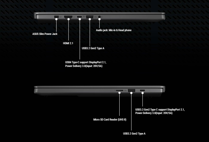 Despite its svelte and supremely portable chassis, the G14 offers all of the connectivity to enable your workflow or the battlestation of your dreams. Dual USB-C ports, both of which support display output, and one that supports both Power Delivery 3.0 and DisplayPort 2.1 make the very most of this versatile connector. With one port on each side of the Zephyrus G14, you can conveniently charge your machine, no matter where you've traveled. For your other peripherals, dual USB 3.2 Gen2 Type-A ports expand connectivity even further. For quick file transfers or extra storage, a dedicated UHS-II MicroSD card reader stands ready.
