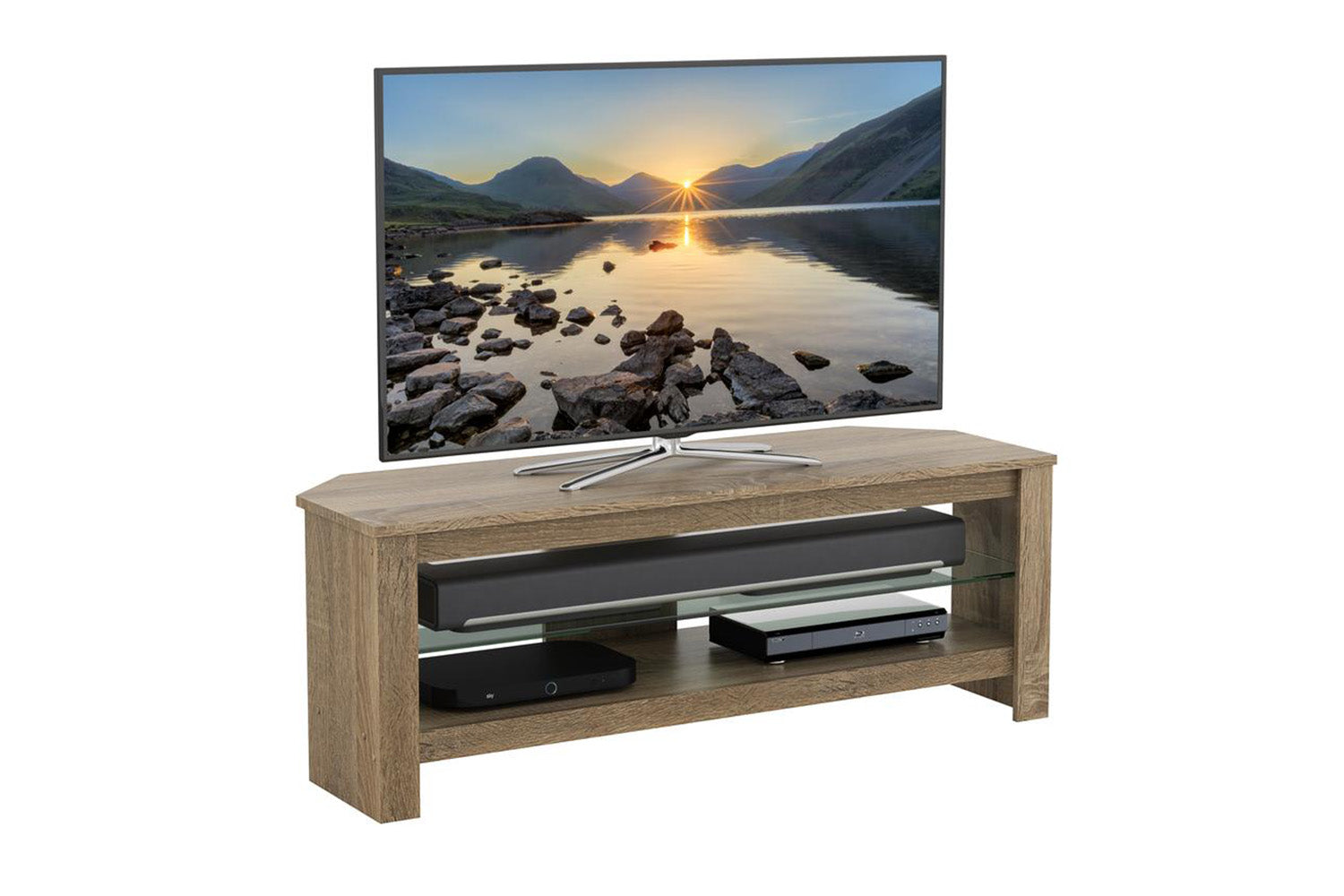 Sturdy construction, finished in a naturally attractive rustic sawn oak wood effect veneer with a toughened glass shelf which provides an elegant way to support your consoles and media players.