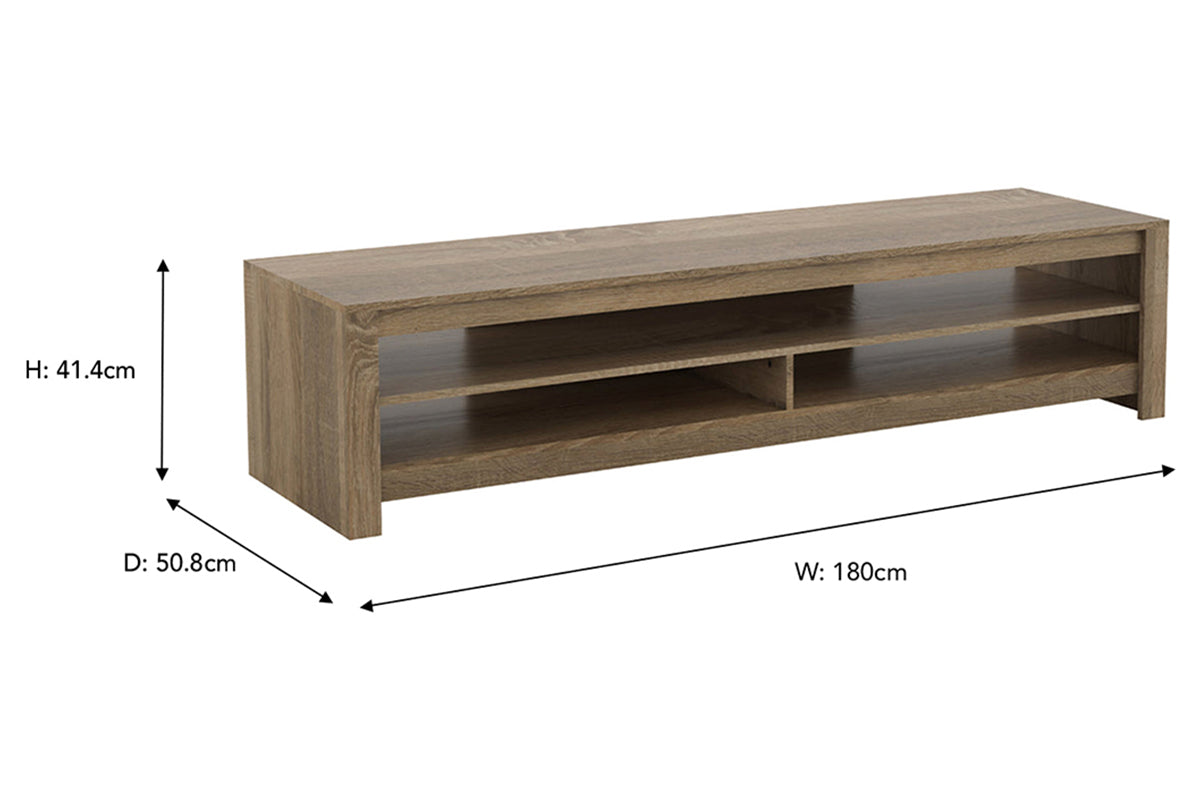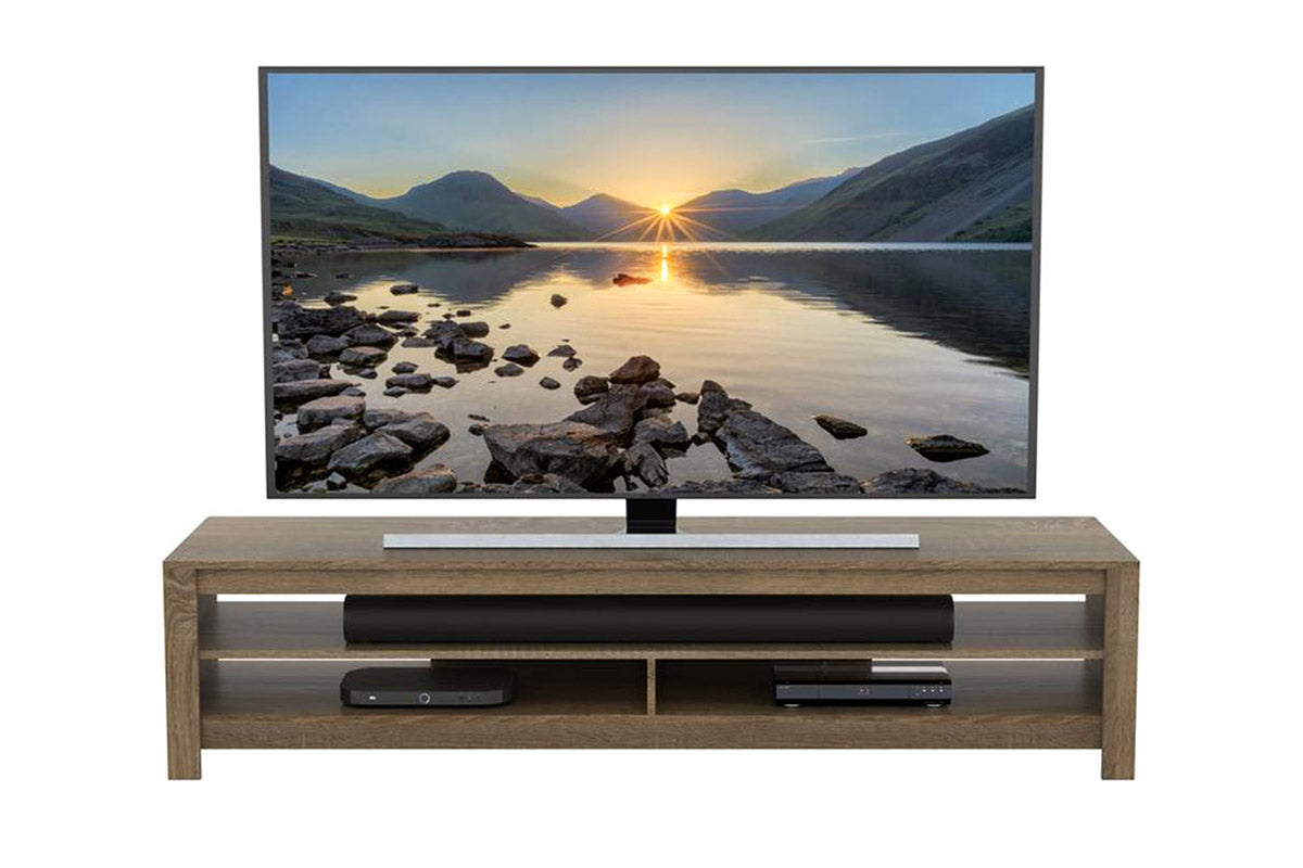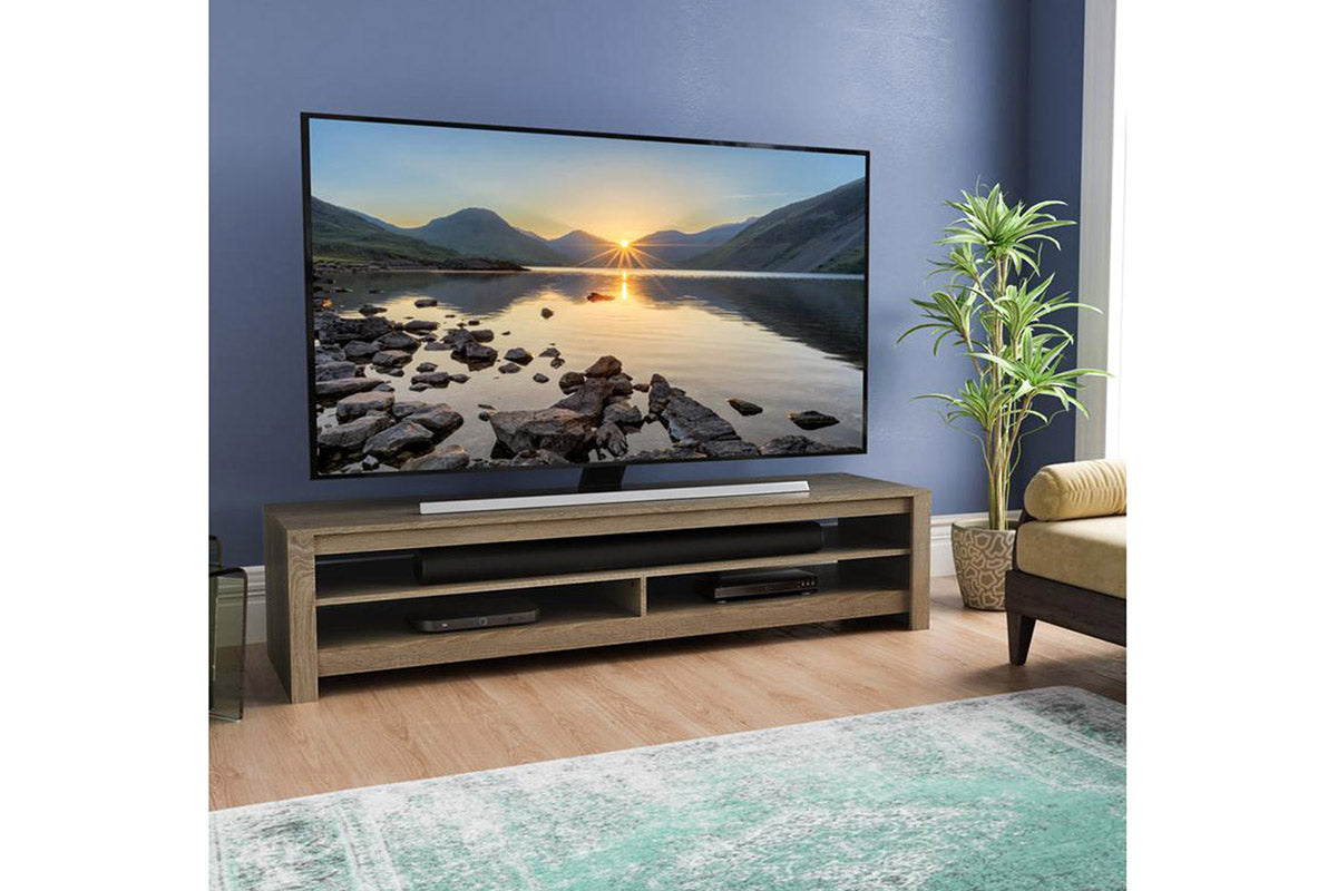The Calibre is the perfect TV stand for TVs up to 85 inch. It’s minimalist design makes it a great piece of furniture for any room setting. Sturdy construction, with a large open aperture perfect for sound bars, finished in a stylish rustic sawn oak wood effect veneer.