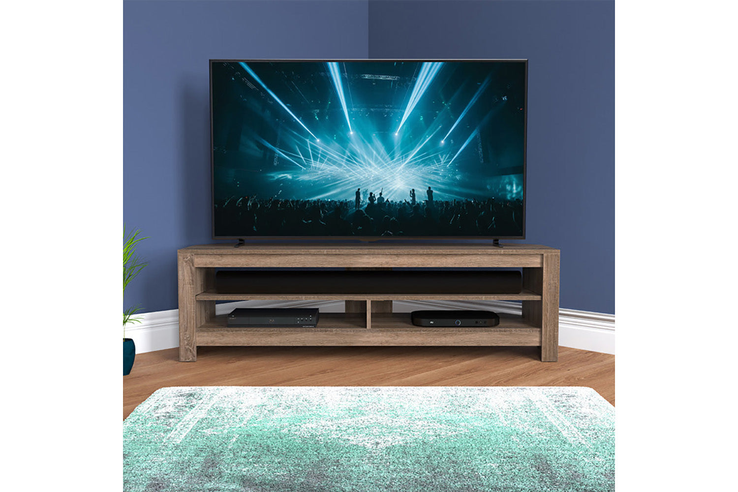 Many soundbars feature upward-firing speakers, but these can get muffled when stored inside a TV stand. Calibre Sound’s unique sliding soundbar shelf maximises your home cinema acoustics, and once the credits roll you can slide the shelf away for a minimalist look. Two storage shelves beneath offer plenty of room for other AV devices, and the back is shaped to fit equally well against a wall or in the corner of the room. Calibre Sound holds TVs up to 65″ and is finished in a naturally attractive Rustic Sawn Oak effect.