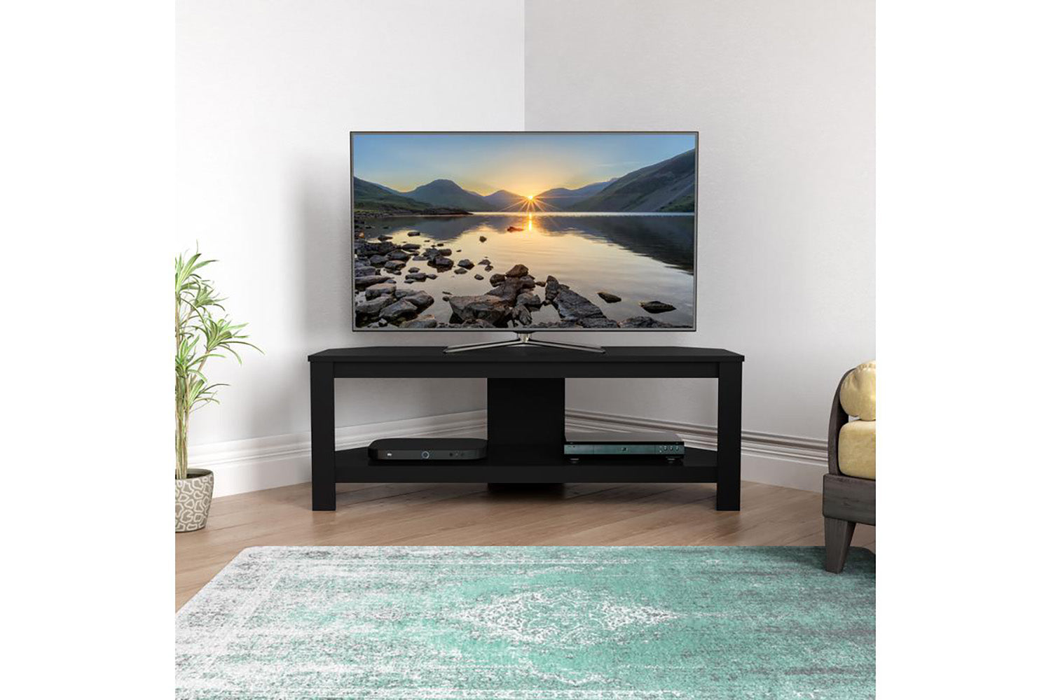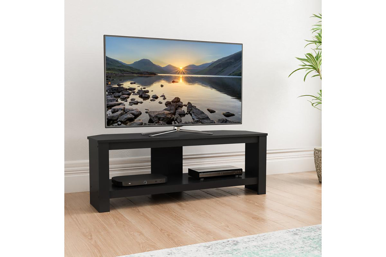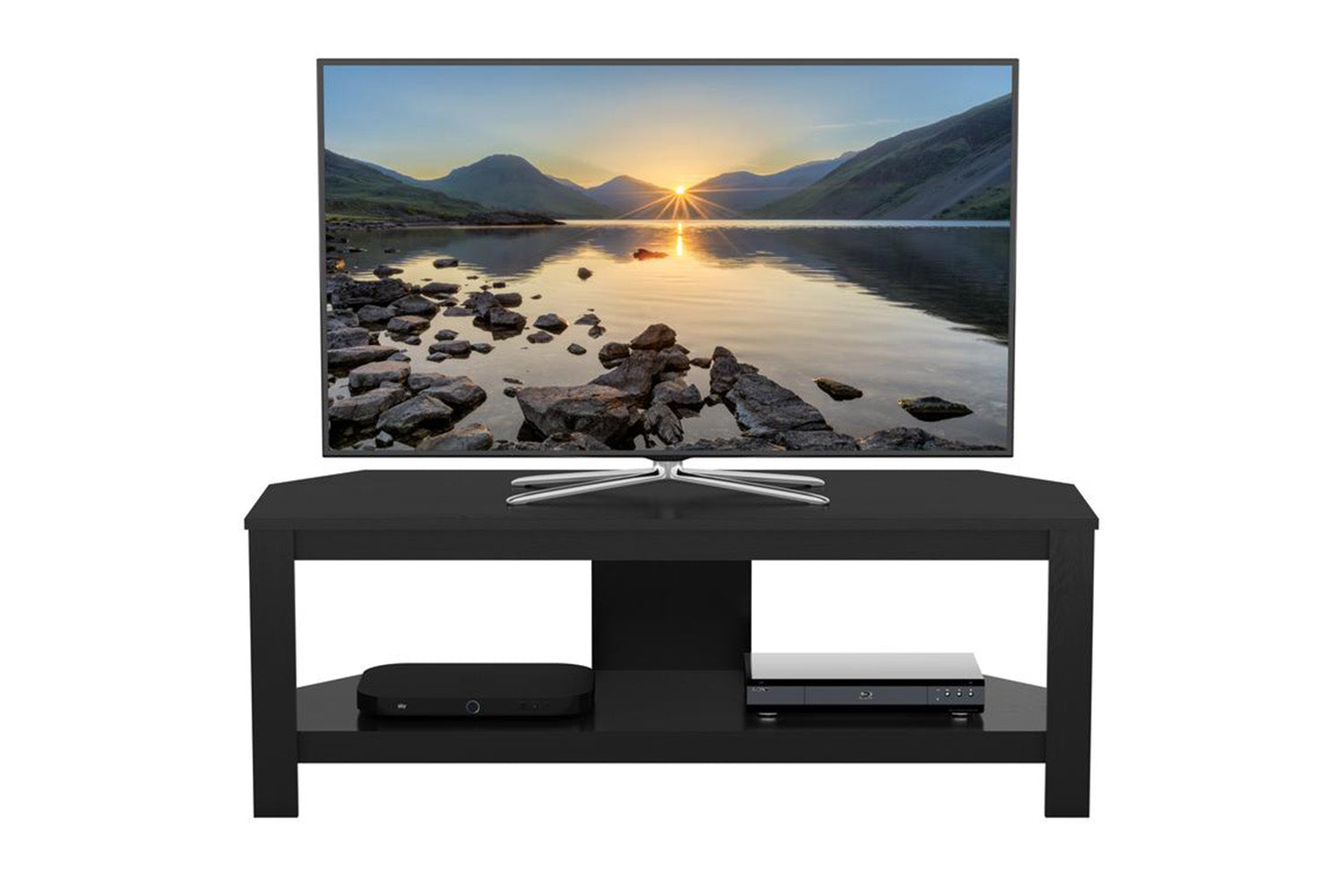 A beautifully constructed TV stand finished in a naturally attractive Black Oak effect, Calibre’s minimalist design makes it a great piece of furniture for any room setting. Designed to fit equally well flat against a wall or in the corner of the room, providing ample space for your TV and home entertainment equipment. Assembly is quick and easy, and all your cables can be kept out of sight behind the rear panel.