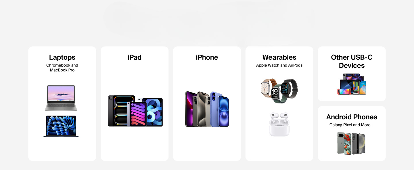 - GaN power to fast charge your iPhone 16 Pro from 0-50% in 27 minutes, Samsung S25 from 0-50% in 27 mins†; Chromebook, iPad Air 13 and MacBook Air 13